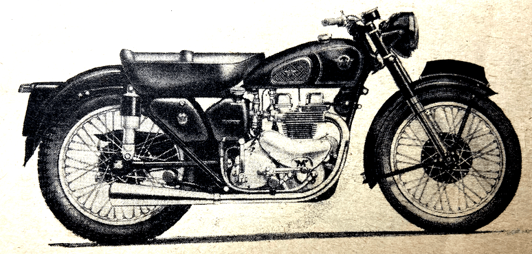 for many years, this unique 1,000 c.c. power unit, known in its latest form as the 4G Mark II, has modified induction and exhaust systems which are said to result in a power output of 40hp at 5,600rpm. In road performance this represents smooth, surging power right up to 100mph and more. Yet such is the efficiency of the new engine that a fuel consumption figure of 65mpg at 50mph is claimed. The sectioned engine reveals the new four-port exhaust layout, which has two bolted-on manifolds. A straight induction pipe, bolted to the top of the cylinder head casting, leads to a cruciform distributory tract…Pistons are available to give a compression ratio of 6.7 to 1 for Pool petrol, or 7.2 to 1 for 80-octane fuel…Proved in the International Six Days’ Trial, the new 498cc Hunter Twin with light-alloy engine is also attracting much attention…Gleaming, chromium-plated fuel tank panels and wheel rims, together with new colour finishes, make an extremely bright and attractive display on
