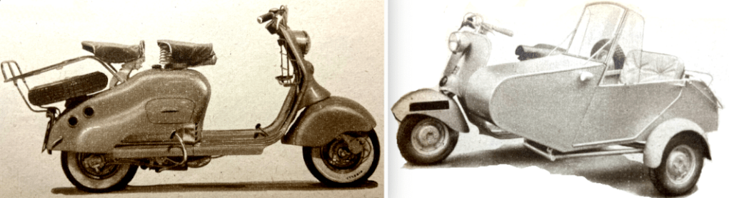 seat Crusader saloon. Garrard’s popular S90 sports model was joined by a child/adult version and the lightweight Gazelle, aimed at bikes from 200-500cc. The Swallow Jet 80 single-seat steel-bodied sportster was one of the best known chairs on the market (I have fond memories of the Jet 80 I ran on my plunger ‘Flash in the early seventies); it was joined by the double-adult Viscount “razor-edged saloon”, Comet child-adult and Commando single-seat saloon. Watsonian, a pioneer of British sidecars, is still very much in business. It displayed “an interesting development in sidecar suspension” incorporating rear coil springs for the body and “a Silentbloc resilient wheel mounting”. The chassis could be mounted on either side. New bodies included the “lightweight Ludlow open single-seat tourer…Detail refinements have been carried out on nearly all other models. The roomy Monarch single-seater has been fitted with a sliding roof coupé hood which allows the passenger seat to be fully enclosed within a few seconds…Also available is a special competition sidecar constructed in light-alloy…a 7in-diameter brake is fitted…In addition some motor cycle manufacturers such as BSA, Norton, OEC and Sunbeam list sidecars.” Also serving the sidecar market in 1952 were Bowser, Greeves, Lambretta, Rankin, Surrey and Trinder.