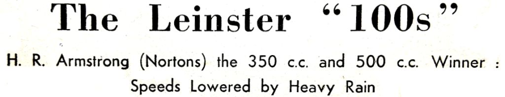 fifth lap and shook off the Kettering rider with a lap at 75.63mph, his best of the race. Arber’s best was at 74.31mph. The Carter brothers of Dublin occupied the next two places for most of the race, Louis, on a ‘Featherbed’, speeded up considerably towards the end and went ahead of his younger brother, Gerard, who was on an older Norton. Only these five covered the full distance, but 11 others, including 0 Sheridan on a 1927 Sunbeam, qualified as finishers. For the 250cc race there were only five starters: three Moto-Guzzis, a Velocette and an Excelsior. RA Mead, on the Velocette, led easily for two laps, making fastest lap at 65.13mph, then retired. W Billington ran out of brakes at Wicklow town corner on the first lap and retired; and TD Sloan, who had a two-camshaft head on his Excelsior, retired with plug trouble. This left AF Wheeler, on the Leon Martin Moto-Guzzi, with a comfortable lead from WJ. Maddrick, on the ex-Ben Drinkwater Moto-Guzzi. RESULTS 350cc Race (12 laps): 1, HR Armstrong (Norton), 78.98mph; 2, K Kavanagh (Norton); 3, WAC McCandless (Norton); fastest lap (record), R Armstrong (Norton), 83.40mph. Class Handicap (private owners): WAC McCandless (Norton). 500cc Race (12 laps): 1, HR Armstrong (Norton), 75.27mph; 2, K Kavanagh (Norton); 3, IK. Arber (Norton); fastest lap, R Armstrong (Norton), 76.97mph. Class Handicap (private owners): IK Arber (Norton). 250cc Race: 1 AF Wheeler (Moto-Guzzi), 60.73mph; 2, WJ Maddrick (Moto-Guzzi); fastest Lap, RA Mead (Velocette), 65.13mph. Hutchinson Trophy (best on handicap): 1, WAC McCandless; 2, R Armstrong; 3, WF Sparling. Skerries Cup (beat novice): WF Sparling. Club Team Prize: Dublin &DMCC No 1 (R Armstrong, L Carter, G Carter).”