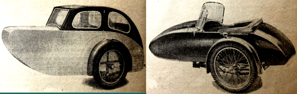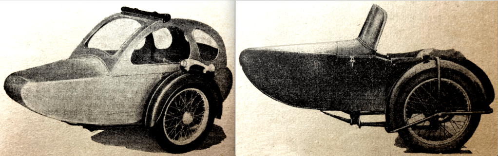 SIX SIDECAR SPECIALISTS exhibited at Earls Court. Blacknell majored on a sprung-wheel conversion for its chassis. “Recently a member of The Motor Cycle staff rode a 600cc BMW and Blacknell Bullet sidecar fited with the sprung wheel. Behaviour of the sidecar wheel inspired the utmost confidence under all conditions. A 7in-high kerb, for instance, could be taken diagonally at moderate speed, sidecar wheel first, without the sidecar becoming dangerously airborne and without any clashing of the suspension.” The new lightweight Convertible was made for bikes from 200-350cc; the body weighed 65lb. Busmar launched two new models, the double-adult York saloon and, “built on sleek Continental lines” and the convertible Dorset which could “serve the double purpose of either a sporting single-seater or spacious child-adult saloon”. Canterbury debuted the double-adult Invader saloon on a sprung chassis and the single-