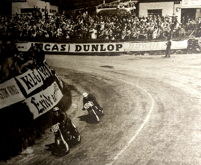 only local entrant, sped through Ramsey and still there was no sign of Brett. A thrilling spectacle, said Parkinson, was that of Graham and Armstrong rocketing through Ramsey together. They hung close together on the mountain climb but Graham seemed to forge head at the Mountain Box. Duke came through the Start in a posture that promised sensations to come. From a standing start he lapped in 24min 11sec, a speed of 93.64mph. Excitement mounted when Graham’s light was the next to flash on, indicating that he was passing Governor’s Bridge. He flashed through the Start second on the road, having overtaken 13 riders who started ahead of him. He completed the lap in 24min 27sec—16 seconds slower than Duke, with a speed of 92.64mph. Ray Amm threw his machine round the corners in spectacular fashion to pass 15 riders on the first lap. Brett came off at Closewood corner, near Sulby, having covered only 19 of the 264 miles of the race. He retired with two minor cuts on a hand, otherwise he was all right, but bang went the hopes of the AJS team, leaving only two Norton combinations to vie for the manufacturer’s team award. AL Parry, a member of the second Norton team, called in at Ballaugh and asked to see a doctor. He had not crashed but was feeling unwell and retired. That left only one manufacturer’s team, the No1 Norton team. Speaking from Ballaugh, Parry reported that he had a few ‘dimouts’ and did not feel too good. AA Fenn (Norton) stopped on the mountain to make adjustments. He proceeded but retired later at the Creg. Mechanical trouble in the form of a seized engine overtook HW Billington (Norton) at Gorselea. It put him out of the race, but he was all right. The end of the first lap found Nortons occupying five of the first six places, with Graham on his eye-catching MV Agusta in second place. Retirements at the pits included JA Pollott (Norton) with a broken chain, and EVC Hardy (AJS) with a broken primary chain. Having come all the way from Southern Rhodesia, NW Stewart (Norton) came off and retired at the Bungalow with minor injuries. The doctor was in attendance. He reported that Stewart had concussion and suspected damage to the pelvis. L Williams (348 Velocette) retired at Birkin’s Corner, on his first lap, with a broken valve spring. Only five seconds outside his last year’s record, Duke swept through the Start, crouching low over his machine. His time of 23min 52sec for the second lap increased his first lap lead of 16 seconds over Graham to 37 seconds. Graham streaked round the second circuit in 24min 13sec (93.52mph), closely followed by WR Amm with a lap of 24min 23sec (92.89mph). Amm was only 24 seconds behind Graham on a growing time. Robin Sherry (Norton) retired at Michael with clutch trouble. He is all right. MB Prudence (Norton) came off at the Gooseneck, made adjustments to his machine, and proceeded. Lomas stopped at the pits at the end of the second lap, changed plugs, and proceeded. By brilliant riding, RW Coleman, the New Zealand ace, the AJS hope, managed to ride his machine into sixth place, the only AJS on the leader board. He completed the lap at 89.11mph. Duke pulled in at the end of his third lap, and amazed the crowd by his quick replenishment. Steve Darbishire, the refueller, had him away in little over 20 seconds. Soon after Les Graham also pulled in at the pits with a screech of brakes. Unfortunately he misjudged the distance and had to man-handle his machine to the pits to the urgent shouts of ‘Come on, Les!’ He made a quick replenishment and got away as Armstrong also pulled in, but he had taken longer than Duke. Graham could ill afford the 46 seconds he took to refuel. Although he slowed up slightly, Duke was still drawing away from Graham. With a lap of 23min 59sec (94.4mph), he increased his lead to 48sec. Graham, whose machine was referred to as an angry wasp, seemed to be losing time on the mountain climb, for while the commentator at Ramsey said Duke was only 24sec ahead of him, at the end of the lap he was twice that amount. Graham completed the lap in 24min 10sec (93.7mph). Rod Coleman, who had a black Kiwi painted on his orange helmet, lost time on the third lap. Earlier he had passed McCandless, but the positions were reversed. McCandless had refuelled and commenced his fourth lap before Coleman pulled in. RDK Hollier (New Zealand) was among those who retired on this lap with engine trouble at Ballaugh. Duke passed through Ramsey well ahead of any other rider, and at this stage it is interesting to compare the times. Dennis Parkinson, commentator at Ramsey, revealed that Duke passed through that point 3min 10sec ahead of anyone else. Next through was Graham, whose actual time lag behind Duke was 35sec, although he had lost more time refuelling. Only 50 yards behind him came another Norton challenge in the form of Armstrong, whom Graham had earlier overtaken. A sensation came when Duke packed up at the pits at the end of this lap. He dismounted while Steve Darbishire, his mechanic, worked feverishly on the clutch. People groaned with disappointment, then came a cheer from his many supporters as he attempted to start again, but it soon changed to groans as he could not get going. He smiled wryly, removed his helmet, kissed his wife and walked resignedly away with people patting him on