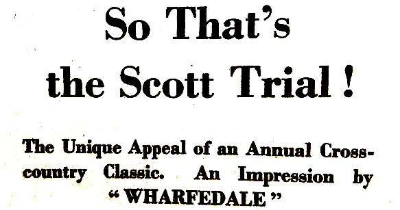 “NO EVENT IN THE motor cycle sporting calendar has quite the traditional attraction of the Scott Trial, always supposing that ‘traditional’ can be applied to an event so continuously and plainly alive and virile. Just what the fascination is becomes rather difficult to define. Probably it accrues from the fact that it was the ‘Scott’ which really began this sport of motor cycle trials riding in the style that we now know it. Almost 40 years ago the ‘Scott’ began as a sort of cross-country point-to-point, in which riders followed a map-course over what were then almost unknown moorlands so far as wheels and engines were concerned. The event went on from year to year, and from difficulty to difficulty. No hazard or obstacle was deemed too difficult provided that somebody, at some time, could persuade a motor cycle to surmount it. Thus a tradition grew up about ‘rough, heartbreaking stuff’. The trial gained national repute, and a collection of stories began to build up around it. As the years roll on, riders retire and join the veterans who look on and criticise. Like the TT for racing men, the event has become an occasion for the aged and the ageing to reminisce about earlier experiences in the series. ‘Do you remember 1927?’ ‘What about 1935?’ ‘It isn’t as bad as last year!’ (Of course it isn’t. It never is!) This sense of the ‘Scott’ being an occasion is very strong. It is a social function as well as a trial. The night before the start, the headquarters hotel is filled with rumours and forebodings. The same place on the evening of the trial is filled with aches, pains and adventure stories—tall ones, often—but never a grumble. Never, ‘It was too much’; more likely, ‘I should have done better’. As an event, the Scott Trial differs from the more usual kind because both time and observation are taken into account. An award can be won on speed alone, on observation alone, or on a combination of the two. There is something diplomatically called ‘standard time’. Every rider who finishes outside it loses one mark for every two minutes. Just what is ‘standard time’? It is simply the time taken by the competitor who covers the course at the highest speed. As the man who establishes standard time is the fastest finisher, he is the only competitor with a zero time loss. The rider who can establish standard time and lose least marks on observation is an expert indeed—and it has been done more than once. The importance of time in the results produces certain unusual effects. There is no controlling of observed sections in the usual one-at-a-time manner, and no prior examination of hazards on foot. It is up to each rider to avoid being baulked by using his own judgment. Hazards, whether they are known or not, must be taken on the run. Last Saturday the scene was again laid in Swaledale, north Yorkshire. The start