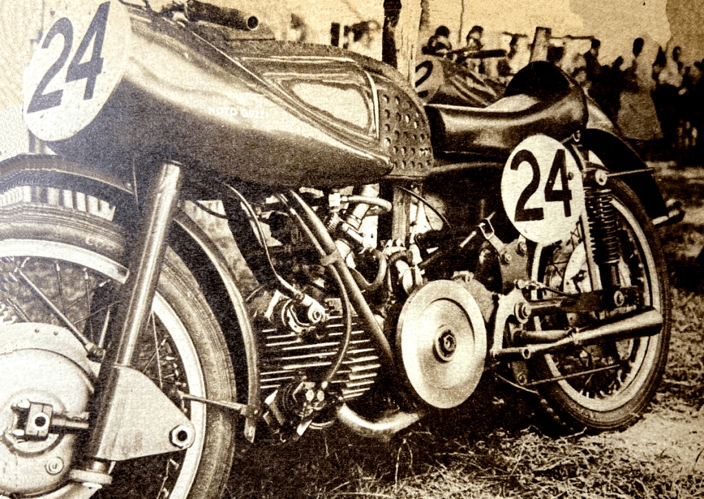 “ON THE FACE OF IT British bikes still led the pack. At the Swiss Grand Prix AJSs finished 1st and 2nd in the 500cc class, with an MV 3rd; a Norton (inevitably ridden by Geoff Duke) led the 350s home followed by an Ajay and another Norton. But it was clear that the lightweight classes were no longer British territory; Fergus Anderson won the 250 race on a Guzzi. Harry Louis, who was to have an illustrious career as editor of the Blue ‘Un, took a well informed look at the Continental challenge: “A most impressive feature of the 500cc race of the Swiss Grand Prix at Berne was the speed and reliability of the new Italian MV Agustas. No one was surprised to see Geoff Duke leading on the first lap. But keeping Duke within sight was Les Graham, whose MV was obviously motoring very well and handling magnificently. According to my timing Graham was never more than 15sec away from Duke until the seventh lap. Duke was leading at around 95mph, and Graham’s average speed could not have been much slower. He called at his pit to examine the rear suspension because at extreme range of upward movement the tyre was rubbing on the mudguard; a lap later he retired since it was foolhardy to take risks. The remedy would be a simple matter, but could not be applied during the race. Another pointer to the performance of the latest MVs is the fact that Carlo Bandirola in the same race finished third at an average speed higher than the previous lap record, which remained intact from 1937 till this year. Only two MVs were competing and both showed great promise in a tigerish race. Engines of the 1952 models are substantially similar to the 1951 units but major changes have been made in the transmission and rear suspension. Primary drive is by gears to a five-speed gear box which, says Graham, provides a quick, certain change. (It will be recalled that one of the bothers with last year’s four-speed machines was the difficulty of avoiding a muffed change and its consequent over-revving of the engine.)