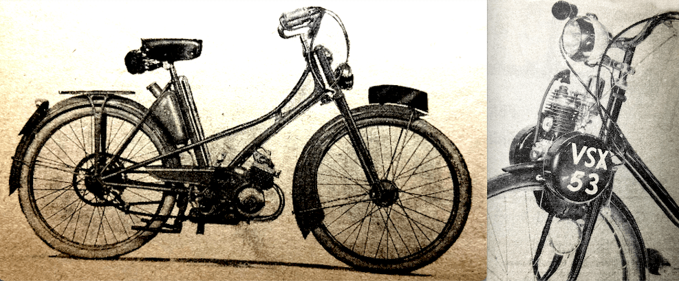 roller. Engine control is effected by two twist-grips; the right-hand grip governs fuel supply, and the left-hand grip varies the compression ratio and port timing…A Netherlands production, the Mobylette is exhibited in three guises and is available only as a complete motorised cycle. Motive power is a 49.9cc two-stroke engine. Primary drive is by belt to a countershaft, and final drive is by chain. The standard model has a solid front fork and rim brakes. Next in price is the Standard de Luxe version with an internal expanding rear brake and automatic, centrifugally operated dutch. Finally, the Super de Luxe model features a telescopic front fork, front and rear internal expanding brakes and the automatic clutch. The ingenious clutch depends on the speed of the cycle, not that of the engine, for its automatic engagement and disengagement; critical speed is approximately 5mph. Thus acceleration and deceleration are simplified and the engine may be kept running when stationary…Although the engine is mounted in front of the steering head and drives the front tyre through a friction toiler, the VeloSolex is available only as a complete motorised cycle. The pet roil tank is mounted alongside the crankcase. Fuel is fed to the floatless carburettor of the 45cc two-stroke engine by means of a membrane pump. Lighting coils are fitted to the flywheel magneto, and the cycle is supplied with oversize tyres, electric lighting, rear carrier and number plates…Not exhibiting at Earls Court are the following: Auto Minon—Available only as complete motorised cycles; 49cc two-stroke engine and single-speed bicycle, £41 18s 4d; 49cc two-stroke engine and bicycle fitted with three-speed hub, £43 9s 2d…VAP—48cc two-stroke engine with clutch and chain drive to rear wheel.”
