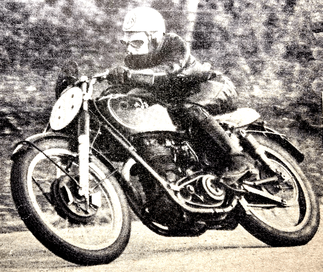 sixth. This order was maintained with half the distance over. but in the third circuit J Bottomley (Triumph) came up ‘out of the blue’ with a lap of 27min 37sec and ‘collared’ third place, thus relegating the rest of the leaders (Clark, Farrant and Tye) to fourth, fifth and sixth men. Even then the outcome was not sure, because at Handley’s Corner Tye (who had ridden a remarkably steady race) had the mis fortune to run out of petrol, and that let RWC Kerr (Triumph) into sixth place. There was only one accident. That occurred in the first lap to James Lanyon, the only Channel Islander in the race, front Guernsey. He came off at Signpost Corner and was taken to Noble’s Hospital, where it was found he was suffering from a crushed vertebra. There were other spills. DJP Wilkins (Norton) came off at Governor’s Bridge; commentator David Lay at Crook-ny-Mona, reported that AW Dobbs (Triumph) got into a colossal slide at that point of the course but managed to stay aboard; RF Keen (Triumph) came off at Windy Corms and damaged his machine but not himself, and KG Brough (BSA) came to grief at Glen Helen, but escaped with minor cuts. JE Williams (Triumph) came off at Parliament Square, Ramsey, on his first lap but was not hurt.” RESULTS: 1, Bernard Hargreaves (Triumph) 82.45mph; 2, Ken James (Norton); 3, John Clark (Norton); 4, Derek Farrant (Norton); 5, Jack Bottomley (Triumph); 6, Robert Kerr (Triumph); 7, Bob Ritchie (Norton); 8, DK Tyndale-Powell (BSA); 9, AM Cook (Triumph); 10,Bill Dobbs (Norton).