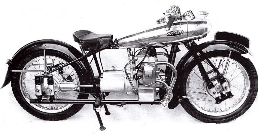 “FEW DESIGNERS HAVE a reputation for unorthodox thought to compare with that possessed J Wooler. Mr Wooler will go down in history as the originator of the ‘Flying Banana’ and of the interesting four-cylinder beam-engine exhibited at Earls Court in l948. The beam-four design has been abandoned in favour of a more orthodox 500cc ohv flat four which I examined recently; it may go into production next spring. The reason for abandonment of the beam engine was that the inertia loadings proved unduly severe, and a high rate of bearing wear resulted. The new four is perhaps the most straightforward Wooler design yet. The cylinders lie across the frame, one pair behind the other. A forged, three-bearing, one-piece crankshaft is employed, and since there are forked and plain connecting rods, the cylinders are not offset. Thus the rocking couple associated with some horizontally opposed designs is eliminated. The crankcase of the new Wooler is a one-piece casting. Cylinders and heads are cast in light alloy and incorporate concealed push-rod tunnels. A car-type, engine-speed clutch drives a four-speed unit-construction gear box. Final drive is by shaft. Ignition current will be supplied on one model by magneto, and on another model by an AC generator mounted at the forward end of the crankshaft. The frame is of the duplex type and is telescopic, plunger-type springing for both front and rear wheels. An opulent-looking light-alloy pressing, the fuel tank enshrouds the steering head tube and incorporates a nacelle housing the head lamp and other electrical components. I hope to be able to report soon that I have had a flip on the model—and that production is on the way…”—Nitor