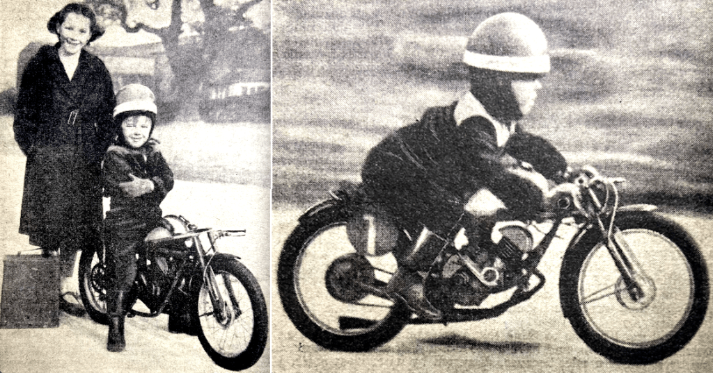 “ROAD RACING, TRIALS riding and scrambling are, to say the least, hard on the model. Another ‘sport’ to take its toll appears to be stunt riding on the stage. According to Tex Martin, who does a sharp-shooting act on the halls while riding a 98cc James, his machine has had its brakes applied hard 20,920 times, has completed 14,300 broadsides, has reared up on its rear wheel 4,320 times, has had its clutch operated 30,000 times and its chains jerked viciously 10,368 times. Recently it was crashed for the 27th time. During the whole of the period, the James was not serviced since it left the factory nine months previously, and it has given no trouble. Shame on you, Mr Martin! If I may make a semi-serious suggestion, it is that the James ought to be serviced now. Then it might well be pensioned off, so that it may pass the remainder of its days quietly, as a self-respecting 98 should.”—Nitor