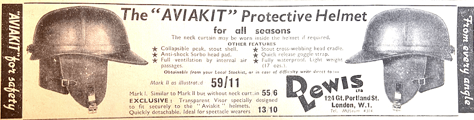 welcome indeed was the warmth of the helmet in cold winds or rain and under wet conditions the peak proved invaluable, fully protecting the rider’s goggles, allowing only a few spots to appear on the lenses during a really heavy shower. Because it was not easy to raise the goggles over the fixed peak, the testers soon acquired the knack of slipping them down to hang around the neck. Similar in construction, the ‘Aviakit’—marketed by D Lewis—was tried out in its latest Mark 2 form, which has a full leather neck curtain, adjustable for closeness of fit. Unlike the ‘Corker’, the ‘Aviakit’ has internal ventilation, this being achieved by arranging four air ducts in the sponge-rubber shock pad. ‘Very comfortable’ was the report of the staffman who used this helmet. Also tested with the helmet was a visor which Lewis produce specially to match. A clear celluloid screen, with a buckled leather head-strap, it fits neatly over the flexible peak and is retained in place by a moulded rubber grommet. At the rear, it is fastened by the goggle strap, which is an integral part of the helmet. Of identical design, with the exception of the use of side flaps instead of a full neck curtain, the ‘Aviakit Mark 1’ weighs 17oz and retails at 55s 6d [£95], while the Mark 2, weighing approximately the same, costs 59s 11d [£110], inc PT. At 42s [£75] inc PT the ‘Cromwell’ is the cheapest helmet on the market. Although, externally, it resembles a racing helmet, it is actually of somewhat different construction. The shell is of wood pulp, bonded by a special synthetic resin. To this extremely strong outer casing is riveted the adjustable head cradle, consisting of three looped webbing straps 1n. wide. The combined chin-strap and necklet is in lined gaberdine and the chinstrap fixing is by means of two press studs. The strap is adjustable and, once it has been set, the buckle need not be touched. The ‘Cromwell’—which, the makers claim, will pass the impact test of the BSS 1869 for crash helmets—weights 17oz. and is both warm and comfortable in wear. The ear holes are provided with muffs to prevent wind rush and to exclude water, while a slightly more expensive edition—priced at 46s 6d [£85] inc PT—is provided with a leather necklet in place of the gaberdine type fitted to the model which was tested. Only one fault was apparent in the ‘Cromwell’, and that only a minor one. The cut-away at the front, which is provided to allow goggles to be comfortably accommodated, proved to be a trifle too shallow to take the popular Mark VIII goggles. These had, perforce, to be rested on the helmet itself, at an angle, which proved to be detrimental to windproofing. Apart from that, the ‘Cromwell’ acquitted itself admirably. When the extremely low price is taken into consideration, it seems destined to achieve popularity amongst riders with whom first cost is of prime importance. There is one further ‘Cromwell’ model which, retailing at 70s [£125] inc PT has a