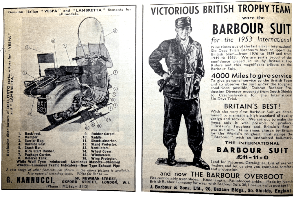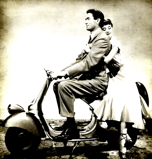 “GREGORY PECK’S LATEST FILM Roman Holiday was shot in Rome. It embodies some terrifying scenes of traffic in narrow streets, with Vespas and Lambrettas hurtling about among the pedestrians in alleys which would be wheeled to all wheeled traffic in England. Some of them are three up! At one point Audrey Hepburn, presumed to have no knowledge of motors, pinches a scooter and departs at speed through heavy traffic on the wrong side of the road. Did they fake it in slow motion and then speed up the film? Or is Audrey in reality a potential scrambler?”