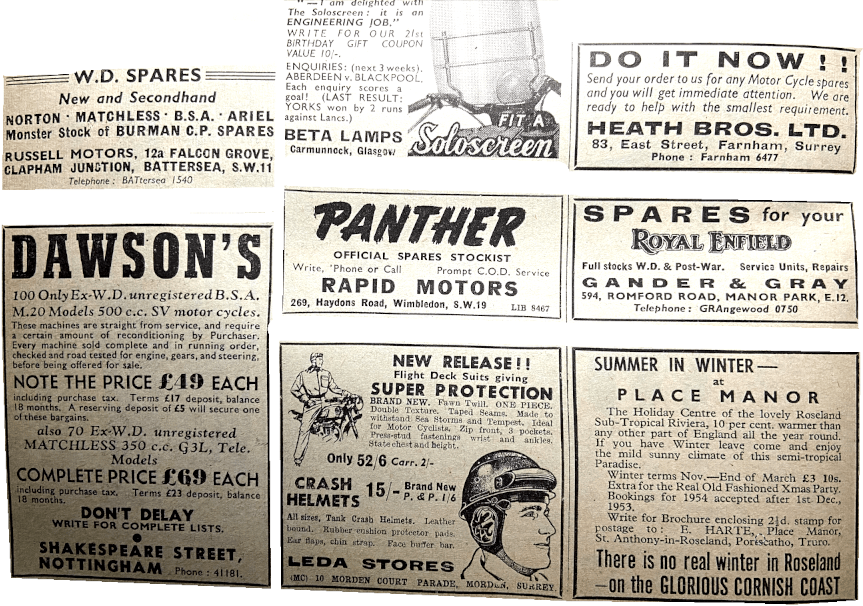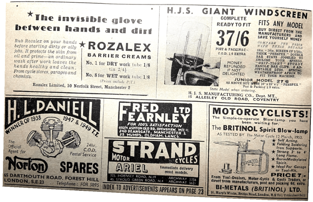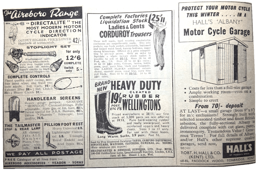 “HAVING COMPETED IN the National Rally I qualified for a silvered plaque. This morning it arrived in a cardboard box measuring 3×3½x¼in, carefully protected inside by corrugated paper. It has been pressed from approximately ¹⁄₃₂in-thick sheet aluminium alloy and could be crushed in one hand quite easily. It does not even have piece of wire at the back so that it can stand up. As for being silvered—why, it does not so much as shine. It is now in its box and there it will stay when my girl friend, who rode pillion, has seen it. A cheaper-looking award I have never seen. I can now understand why the event was not over-subscribed. The entrants must have been club members (who have something to win) and newcomers like myself. Give us our seventeen-and-sixpennyworth and we’ll enter again. Please do not tell me that one enters for the friendly rivalry and comradeship of the affair. Let the ACU run one with no awards and see how many entries are received for that.