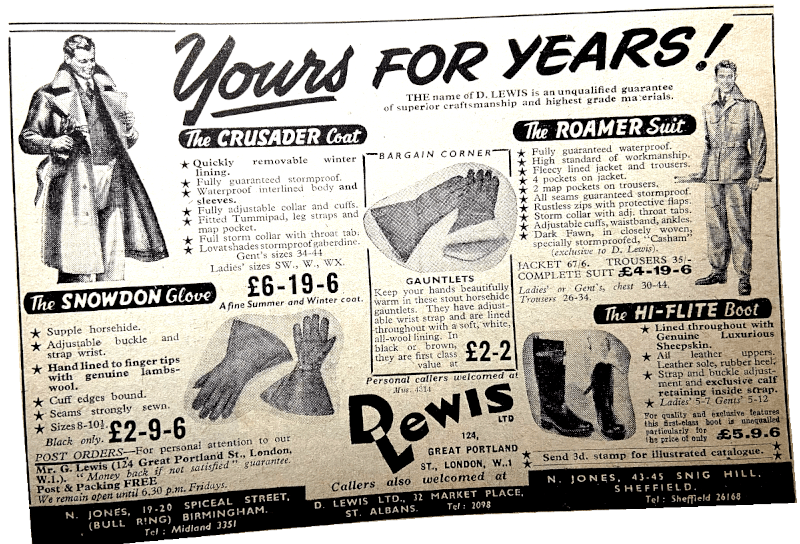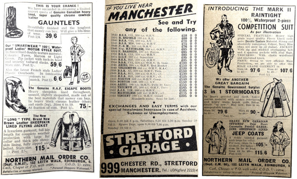 “AS A MERE MALE who also favours breeches and boots for serious riding, I should like to endorse Miss King’s statement about their warmth, tidiness and general suitability. To allay her fears about not looking feminine, I should like to say that I remember her as the only woman competitor in our last two Cheddar Gorge night trials; and at the finish, after riding her fiancé’s Flash a distance of about 160 miles overnight, she, in her safety helmet and breeches, etc, put to shame the untidy gas-cape-and-flapping-leggings brigade. It seems to me funny that a chap will spend upward of £200 on a model and then begrudge £10 or so for one of the many excellent coats or two-piece suits now on the market. To the West End playboy Miss King may look a little out of place, but to a motor cyclist (and who else matters?) she looks very feminine indeed and, what is more important, extremely efficient.