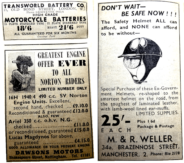 “I DO NOT WANT to wear a safety helmet for many reasons. Who among us has not enjoyed the cool evening air on the brow? Who has not saved money by detecting an audible fault and stopping in time?…I personally cannot stand anything around my ears and back of the neck at any time. I have been a motor cyclist for 18 years, averaging about 20,000 miles per year. In all that time I have personally known of only two cracked skulls—one was a rider who had worked too much overtime during the war; he had a black out while riding, fell from his machine and stopped a rolling beer barrel with his head. The other was a young lady inside her father’s family saloon car. I have made many friends and contacts in the motor cycling world, apart from the sporting fraternity, and have known of many motor cycle accidents. I recently canvassed among my friends—eight motor cyclists to be precise—and none of them personally knew of a cracked skull or a case where a helmet saved a life without any doubt. I know of several would-be motorcyclists who have been put off by the prospect of ‘having to wear a safety hat’…by wearing them I believe we only impress the general public with the danger of the motor cycle. Whether or not the reader is in favour of these hats, compulsory legislation must he fought to the last. Motor cycling for business or pleasure will be absolute misery. Think of the restrictions as they affect as personally—nip up the road for cigarettes; better walk. Offer a lift to Bill Brown from the local bus stop—sorry, old man, you need a hat. Stop the model and have a walk round to view the scenery; you must carry it with you. If some character steals the hat—walk home, brother!