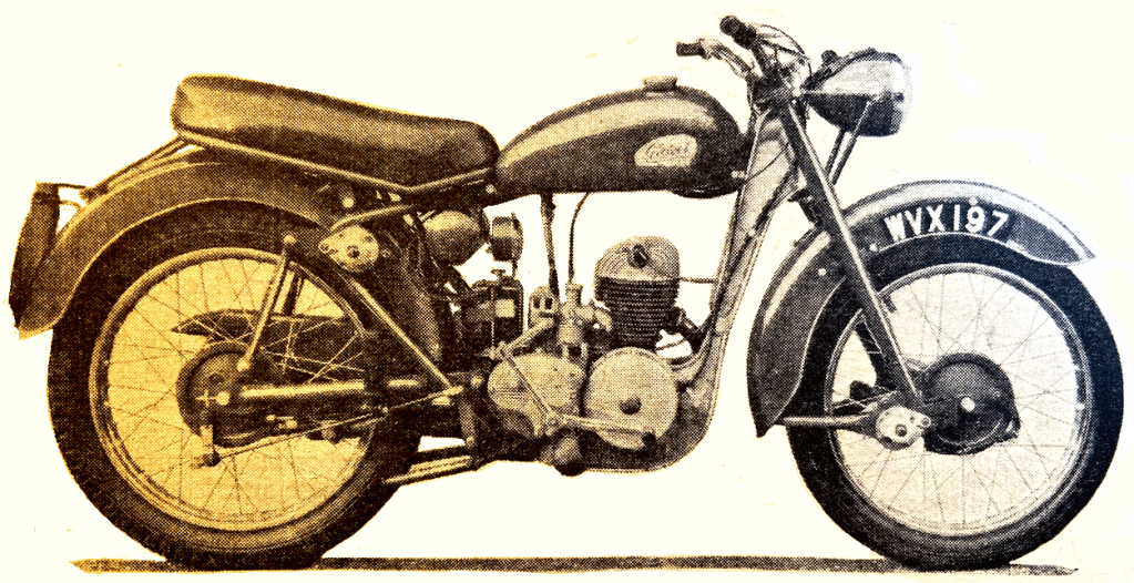 and permits bottom gear to be selected without noise. Engagement is smooth and permits bottom gear to be selected without noise. A time lag of some seconds is necessary to ensure noiseless gearchanges, although those even made hastily are quite positive. Ratios are, well chosen. The lack of fourth speed is more noticeable with small-capacity engines, but the engine-torque characteristic made good this ratio deficiency in reasonable fashion. Steep hills called for second gear, but the majority of main-road inclines in anything but very hilly country could be climbed in top gear. Gear changes were made almost immediately from first to second, and top gear was selected at 25mph. Continual cruising at a speed just below 40mph is comfortable and without effort. At this road speed in top gear the machine is free from vibration—vibration is noticeably absent at all but maximum throttle openings. Exhaust noise was, at an average level, not unduly obtrusive. It is difficult to refrain from over-praising the steering and road-holding. Light and responsive, it was always quite positive and, to the maximum gait of which the machine was capable, proved more than adequate. Minimum non-snatch speed in top gear was about 13mph and the engine would accelerate from this speed on a level road without distress. Mention must be made of the twist-grip, which is not of the conventional drum type. It was smooth in operation, did not shut incontinently when released and had only a slight amount of backlash. Both brakes, of 5in. diameter, have cast-iron drums and are well above average in both sensitivity and efficiency. Hand and foot controls worked smoothly; the pedal for the rear brake is well positioned and can be operated without taking foot from the footrest. Ample light is available for night-riding; the head lamp is capable of throwing a beam far enough. and with sufficient intensity, for a road speed beyond the capabilities of the machine. A dipping switch controls beam-direction and a parking light is supplied from a small proprietary dry battery in the head lamp. This turned out to he the only piece of electrical equipment which failed during the test. Normal top-overhaul can be done with the petrol tank undisturbed. When the cylinder barrel is to be removed, the tank bolts will have to be taken out and the tank lifted an inch. Routine maintenance jobs are few and quickly done. Contact-breaker adjustment is made via a small cover-plate in the generator housing secured by two screws. The gearbox is filled through a small plug on the near side; a wing-nut adjusts the rear brake and a knurled screw and locknut is provided for the front brake. While the lack of a rubber cover to the kick-starter is not important, a cover to the gear-change control would increase the rider’s comfort when operating the pedal and reduce the risk of damage to shoes.”
