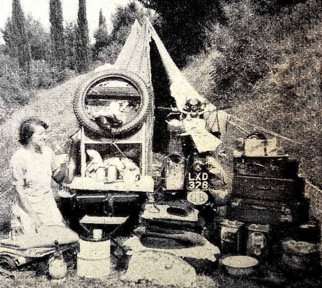 “ALTHOUGH I NEVER travel light at the expense of my comfort and convenience, this photograph places me right in the forefront of the pyjamas and toothbrush class. The machine is a Panther, the sidecar of home construction. The items carried. included one large suitcase containing Madame’s clothes (she likes to be prepared for any social occasion or contingency caused by the weather), two smaller cases containing food supplies and cooking utensils, a one-gallon water can, folding stool, a tent, axe, air bed, groundsheet, a fourth case for clothing, blankets, cushions, panniers carrying a pressure stove and a paraffin container. In addition there were oilskins, a one-piece suit, overboots, spare chains, and a spare inner tube. The whole paraphernalia can be detached and laid out for customs inspection in five minutes. On a trip on which two children were carried, the outfit tipped the scales—wrecked them probably—at two pounds short of 12cwt. Thus loaded, the outfit completed two Continental tours, covering 500 miles of autobahn on one occasion in some 12 hours. The owner is CH Salford, of London. I think that most of us regard the Model 100 Panther as a sidecar machine par excellence. Even so, it seems that the most pro-Panther of us must forthwith revise his ideas of the Model 100’s capabilities. Even when it is subject to the sort of work that would make the Society for the Prevention of Cruelty to Motor Cycles raise horrified eyebrows, the Panther’s thirst is not excessive. A three-weeks’ tour en famille, in which the camping gear was used on only five nights, cost £70 [£2,500 in 2026].”