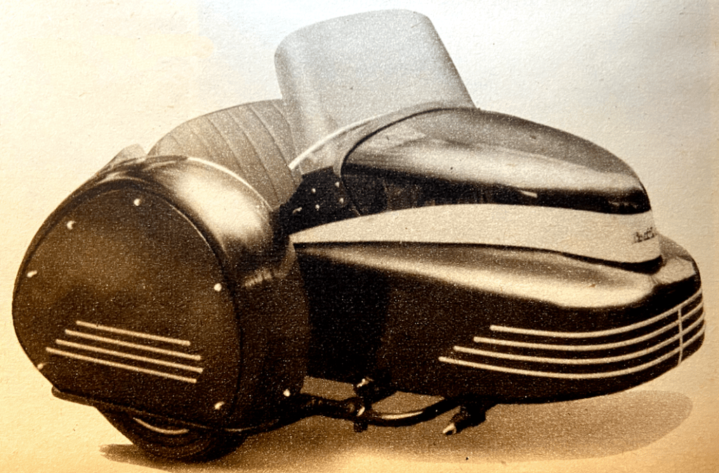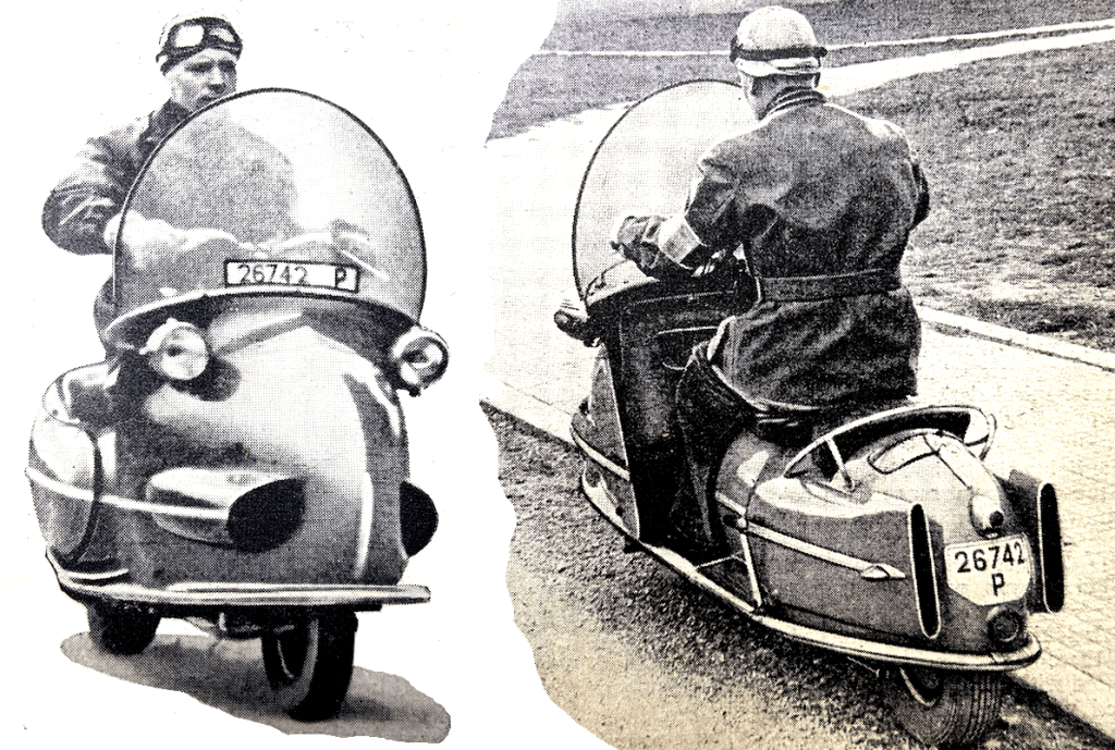 gear box pivoting with the arm so that there is no variation in chain tension. The streamlined, light-alloy nose has louvres for the entry of cooling air and is so profiled that the windscreen is, and looks, an integral part of it. Enclosed within the nose are the fuel tank and the steering linkage connecting the handlebar to the hub of the front wheel…The steering felt ultra-light and ultra-sensitive, and my passage from the trial starting area to the main road was like a landlubber’s promenade along the deck of a ship while he is trying to find his sea legs. The scooter heeled over for turns with next to no effort from me and without pressure on the handlebar. Throughout my trial run this characteristic was to impress itself more and more. There was a feeling of complete remoteness between the handle-bar and the front wheel. Apart from the fact that the throttle, brake and clutch controls had to be mounted conveniently, and the handlebar was a convenient mounting, there appeared to be no other reason for having a handlebar—once the machine was on the move. The vehicle suffered from lack of adequate lock—the seemingly inevitable snag associated with this particular steering layout. As with the Ner-a-Car, so it was with the Hausman scooter. Stability was outstandingly good. Steering was of the hairline variety. After five minutes I was completely at ease, more so, probably, than is ever possible with any other type of two-wheeler. The beautifully controlled suspension provided more than adequate comfort. Weather protection was, of course, excellent.”