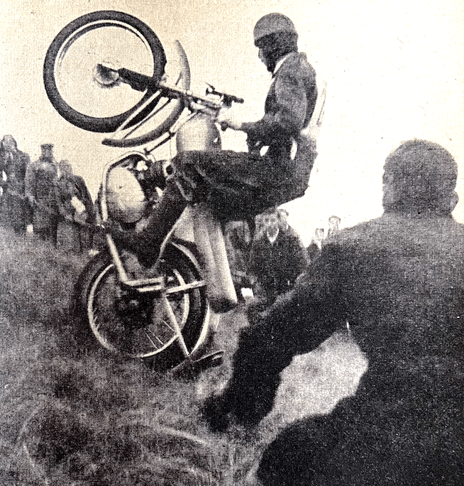 “THERE WAS A RECORD attendance at Hawkestone Park, Hine Heath, when the Salop Club held its Championship Scramble. Though the event was restricted, there was an excellent entry which included the cream of British scramble riders and two very welcome visitors from Holland, one of whom, H Reitman, was the Dutch Moto-cross Champion for 1952. Reitman added the Hawkestone Championship trophy to his collection amid a great ovation from the enthusiastic crowd of spectators, estimated at more than 15,000. In dry, sunny weather, an excellent afternoon’s racing was witnessed. All events, including the many heats, were closely contested, and in some of the finals the pace was extremely hot—the result of some skilful and spectacular riding by the experts.”
