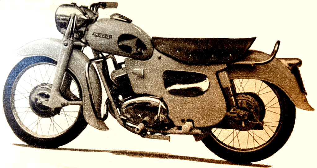 suspension which is frequently by a lightweight telescopic fork. However, girder and bottom-link designs are also to be found. An example of the latter is the Derny, which features leading links and rubber-band springing. There are several tandems with built-in engines. Several cyclomoteurs have smaller wheels than normal bicycles, and two speeds are available as an extra on certain models. The next step may well be the general adoption of rear springing; a neat plunger system is featured by Horsy on one model. In the velomoteur category, the most interesting feature is the appearance of 70cc (and 49cc) Lavallette three-speed two-strokes. Their transmission comprises three pinions on the end of the crankshaft, revolving with it, and a further three (meshing with the first three) on the output shaft. The second trio float on the shaft, but any one of them can be brought into engagement by sliding dogs. Gear selection is preselective, by twistgrip. Lavalette engines are featured on several machines including Génial Lucifer, Sterling and FR. The comparatively high cost of the luxury scooter, with its engine of 125cc or more and its elaborate pressings, has led to the appearance of several lightweight scooters or near scooters. The Motobloc, for example, has a 75cc two-speed power unit enclosed and located ahead of the rear wheel. It has a simple loop frame, no rear springing, well valanced