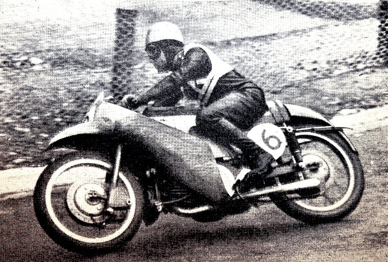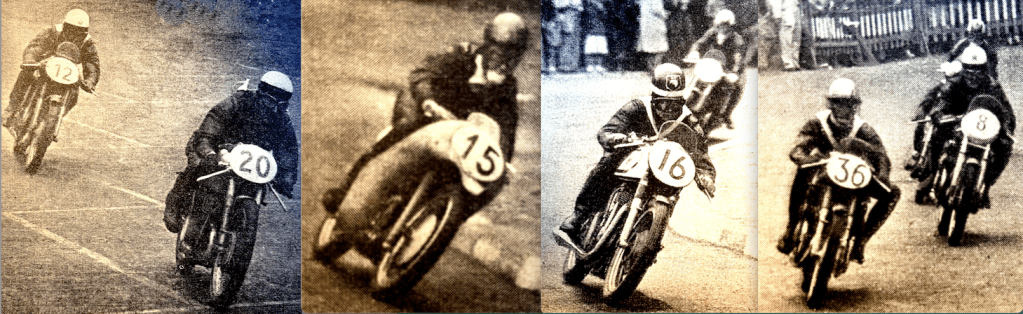 Libero Liberati (Gilera) to fourth. Behind Liberati streaked FK Anderson (Moto-Guzzi), M Giani (MV Agusta), B Francisci (MV Agusta), P Monneret (Gilera), and W. Zeller (BMW). For four laps Duke and Dale rode wheel to wheel. There were no important changes behind them except that Monneret moved up one place. On Lap 7 Duke dug in his spurs and gradually drew away from Dale. In six more laps his lead was 6.4sec. Dale, meanwhile, had drawn well away from Sandford, and Anderson, in fourth place, was ahead of Liberati. Armstrong, causing the crowds to swoon with his style and speed, was rapidly cleaving his way forward. On Lap 10 Zeller retired and on the next lap Anderson made a pit stop that cost him many places. Duke was steadily increasing his lead. After 14 laps it was 9sec, after 15 laps, 13.43sec. Sandford by then was perceptibly slowing and on Lap 14 Liberati moved up into third place. Monneret was fifth, Armstrong sixth! Anderson retired because of fuel shortage at the injector units. Two laps later Monneret overtook Sandford. There were no further changes until the 23rd lap when Liberati again headed Monneret and Armstrong displaced Sandford. Monneret was not to be outdone for long, however, and he battled with Liberati for lap after lap. Duke’s lead after 23 laps was 21.2sec, and 29.4sec after 27 laps. There were no other notable changes except that Monneret had to call it a day only two laps from the finish. He pushed over the line to gain ninth place. Results: 1, GE Duke (Gilera), 107.12mph; 2, RH Dale (Gilera); 3, L Liberati (Gilera); 4, HR Armstrong (Gilera); 5, CC Sandford (MV Agusta); 6, HP Muller (MV Agusta). Fastest Lap: 108.01mph.”