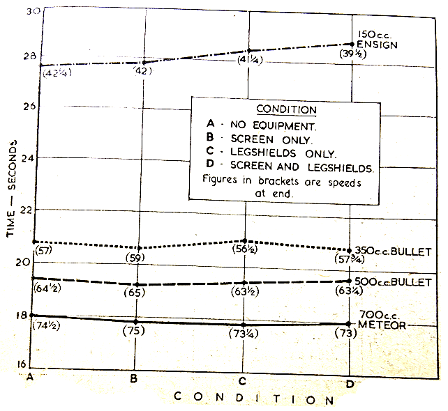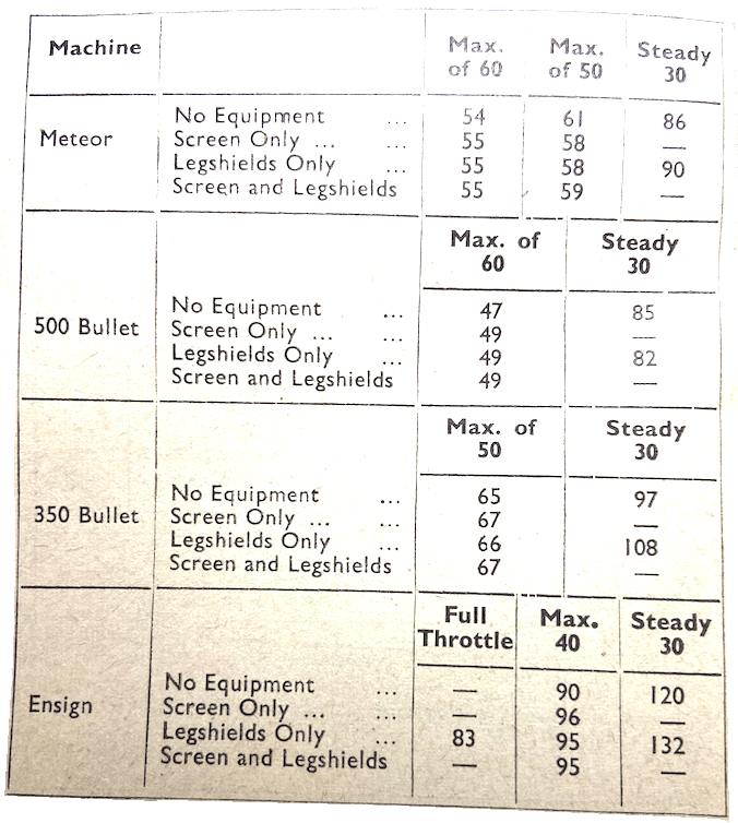 should be virtually unaffected by pannier bulk, although the weight of heavily loaded panthers would obviously impair acceleration. (b) A windscreen on its own should have a beneficial effect on maximum speed, with a corresponding gain in the upper levels of acceleration. (c) Legshields on their own, if of the fiat pattern, should reduce maximum speed slightly, with an almost negligible effect on acceleration. (d) Screen and legshields together are likely to cause a small reduction in speed, again with no serious impairment of acceleration. On lightweights the influence of weight on acceleration would appear to be more important than that of drag. (e) The difference in maximum speed obtainable with small- and big-stature riders should be in the neighbourhood of 2mph, while the addition of a pillion passenger should have much the same effect. The presence of a passenger should make more difference to acceleration than the equipment fitted. (f) Normal types of riding clothing are unlikely to make a difference of much over a mile an hour on maximum speed; acceleration should be only minutely altered. (g) Fuel consumption in the normal speed range should scarcely be affected by the equipment fitted, unless a disturbance of the air flow to the carburettor results. Driving methods have a far more important bearing on the mpg obtainable. (h) The effect of riding position on maximum speed is appreciated by most riders, though it has little touring significance. If the rider adopts an ‘on the tank’ position instead of the normal upright posture, the maximum speed can be increased to a greater extent than by any other expedient; the actual improvement will vary with the capabilities of the machine, but may be as much as 10mph for a machine of high performance. This article should not conclude without a tribute to the machines, each of which did at least 32 full-bore trips on the timing straight and at least 16 standing ‘quarters’, which really punish the clutch (apart from the engine and gear box). The Royal Enfields seemed to thrive on such treatment, and the only trouble encountered which necessitated an interruption of the tests was clutch slip on the 500 Bullet. This was referred to in our roadtest report and recurred early on in the maximum-speed runs; a quick change was made with the clutch from the 500 Twin which served as a hack machine during the three days.”