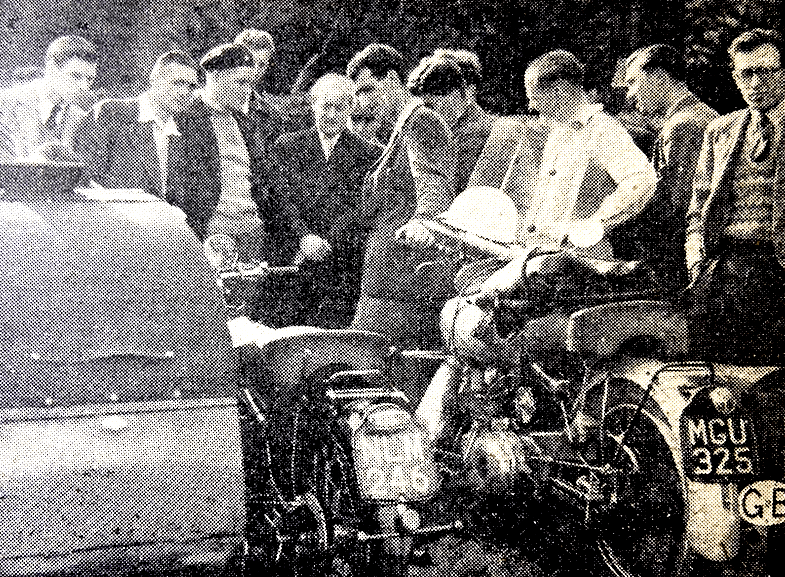 hill when Motor Cycling’s man arrived to find that already a score or so of early numbers had made their ascents, with varying degrees of success…Loose stones and a certain amount of leafmould on the otherwise dry surface caused stoppages for 2nd Lt RFF Lane, Gnr PN Waters and L/Cpl J Godstone (all 350 Matchlesses), L/Cpl J Stimpson (500 BSA), Pte D Ricketts (500 BSA), and Gnr J. Stone (350 Matchless). By now the sun had replaced the moon and though it was cold watching, the scene, in the clear morning light, was enchanting. Only the scents of summer flowers and heather were lacking and to make up for these A Putman (500 Rudge) drenched the woods with the pungent odour of ‘Castrol R’. The first sidecar to essay the climb was a 500AJS in the hands of DS Campbell. A little less pressure in the rear tyre might have helped him to find more wheelgrip. Using one of the old spring-steel-type chassis on his 500 Rudge, E Travers made a very good showing, and then came that MCC stalwart, RW Praill. After some difficulty in getting away from the starting line he swept round the first bend in spectacular style, but his huge engine had more power than the rear wheel could cope with and the mighty combination stopped half-way up the hill. A very good climb indeed came from PGM Harris (1,000 Vincent sc) and JH Hodge (500 Ariel sc) was also noted as excellent. When it was his turn to try the climb SH Goddard found that he needed to adjust the clutch of his Sun-Villiers outfit, which had already suffered a severe buffeting when a collision occurred with a cow during the night on Salisbury plain. Using standard touring outfits, WE Rose (” Norton Dominator sc) and MG Newton (500 Triumph sc) both showed onlookers how it should be done. Via Moretonhampstead, the route led to Waterworks Hill, a narrow, greasy trench-like little path running up a bank beside the dam of a reservoir. Half-way up the track was a stop-and-restart test which was not by any means easy. Then, in another nine miles, through Bovey Tracey and llsington, came that hoary ‘Exeter’ terror, Simms Hill. Except for a smearing of mud on the approaching right-hand sweep there was a dry path all the way up but even so, many competitors found the steep gradient too much for them, especially as each ascent had to be made from a standing start. The crowd was early treated to some excitement when the sidecars arrived. First Harris tore up on his Vincent and all but tipped over backwards when the sidecar body parted from its front securing bolts and reared upwards. But, as one man in perfect unison, driver and passenger threw their weight forward and brought down the aviating coachwork, to continue ‘clean’ to the summit. The only other ‘chair’ driver to bring off an unpenalised climb was Hodge and he and his passenger up-turned the outfit just as they reached the end of the section. Among the general run of the solos the standard of riding varied considerably—from the polished ‘flat-in-two’ attack of the ‘comp model’ rider to the nervously hesitant attempt of the obvious first-timer. That is a feature of the ‘Exeter’ to which all regular spectators are accustomed. But few, it is imagined, were prepared for the ‘fireworks’ provided by the two Douglas-Vespa riders. First, with a calico-tearing scream reminiscent of a Gilera ‘four’ came AJ Bailey. Round the. first bend he swept at tremendous