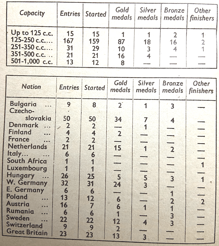 NV), 766. 5, Hungary: G Stoke (123 Csepel), J Reiss (247 Csepel), J Ruzsai (247 Csepel), A. Harangvolgyi (247 Csepel), J Rusovszki (247 Csepel ), 1,643. International Silver Vase—1, Czechoslovakia B: V. Kolar (150 CZ), F Blaha (150 CZ), B Kabat (150 CZ); no marks lost (1,650.7 speed-test rating). 2, Poland B: R Zurawiecki (248 Jawa), A. Kwiatkowski (248 Jawa), W Markowskl (248 Jawa ): 0 (1,372.1). 3, Great Britain A: CM Ray (498 Ariel), DS Evans (498 Royal Enfield), E Usher (498 Matchless), 0 (771.3). 4, Netherlands B: MP den Haan (174 Maico), M Rosenberg (498 Matchless), P Knijnenburg (499 BSA), 3. 5, Sweden A: R Nystrom (499 Royal Enfield), A Elgebrandt (499 Royal Enfield), B Nystrom (499 Royal Enfield), 10. 6, Great Britain B: DS Tye (341 BSA), NS Holmes (498 Ariel), J Giles (498 Triumph), 17. 7, Sweden B: B Erikson (174 Husqvarna), L Lindstrom (174 Husqvarna), L0 Hagman, (174 Husqvarna), 21. 8, Bulgaria: TG Gigov (246 Jawa), SP Bardarov (248 Jawa), JI Toplodoskidi (248 Jawa), 41. 9, Rumania A: N Buescu (248 Jawa), M Saratenu (248 Jawa), N Sadeanu, 54. 10, Czechoslovakia A: J Cizek (348 Jawa), L Stajner (248 Jawa), J Bednar (248 Jawa), 160. 11, Netherlands A: BL Jansema (248 Jawa), Ph JJ Haaker (248 Jawa), H Veer (248 Jawa), 241. 12, Western Germany: W. Aukthum (174 Maico), H Oelerich (342 Horex), U Kraemer (247 Adler), 260. 13, Hungary A: I Reizs (123 Csepel), G Csepregi (248 Jawa), A Urmos (247 Csepel), 490. 14, Poland A: J Jankowski (150 CZ), S Brun (150 CZ), Z Kupczyk (150 CZ), 768. 15, Rumania B: N Niculici (348 Jawa), E Somlo (348 Jawa), M Cernescu (348 Jawa), 774. 16, Hungary B: K Nagy (344 Jawa), A Szabo (344 Jawa), I Boros (344 Jawa), 923. 17, Switzerland: K Meier (342 Horex sc), E Sager (174 Puch), S Mazzola (590 BMW), 1,029. Manufacturers’ Team Prizes (no marks lost)— Ariel: CM Ray, WSG Parsons, NS Holmes. AMC: E Usher and SB Manns (Matchlesses), BHM Viney (AJS). Royal Enfield: JV Brittaln, DS Evans, WJ Stocker. Jawa: L Stainer, J Kubes, J Bodnar. CZ: J Pudil, F Blaha, E Marha. Club Team Prize (no marks lost, position decided on speed test)—1: Ustredni dum armady I (Czechoslovakia): M Soucek, 0 Chasak and K Buchuar (all on 150 CZs). 2, ADAC Maico Frankfurt (Western Germany). 3, SMK Hedemora (Sweden). 4, ADAC Gau Südbayern München (Western Germany). 5, Ustredni dum armady II (Czechoslovakia). 6, SAMS (Sweden). 7, Motorklub ONS Genergen 1945 (Netherlands). 8, Motorklub de Ronde Vencia (Netherlands).