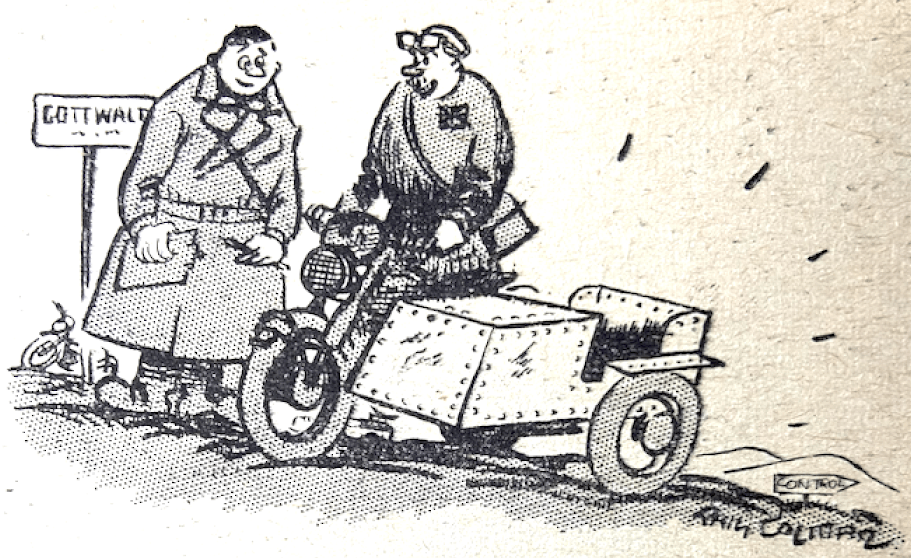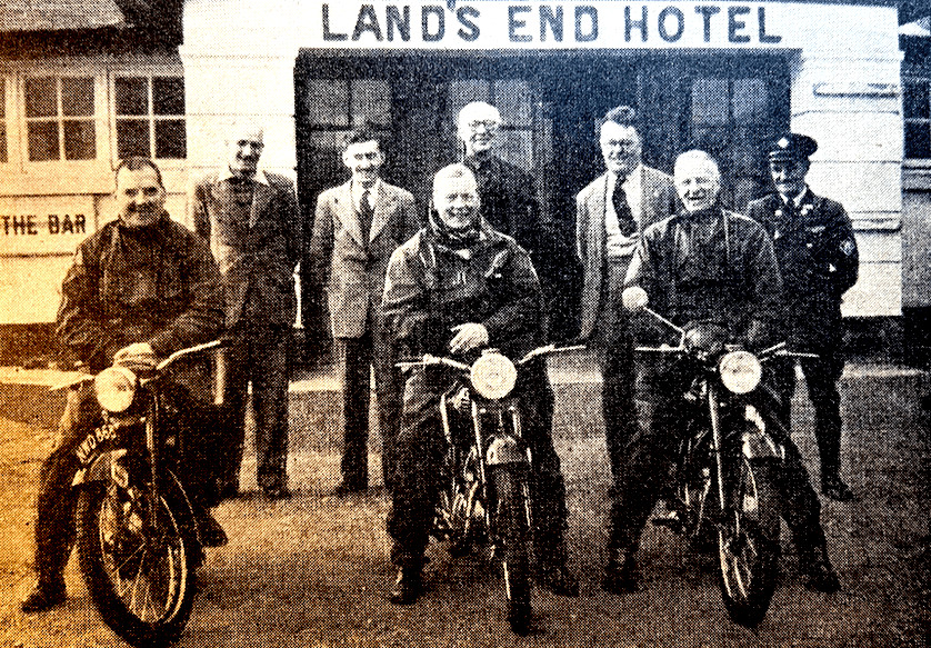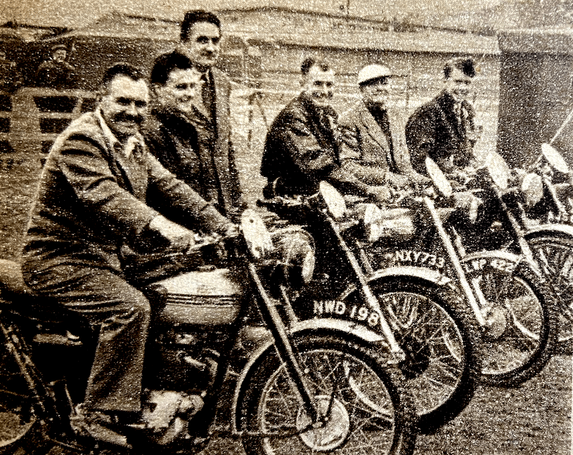 speed and was going like the proverbial ‘clappers’ when his small front wheel slid away on a patch of mould and he had to foot vigorously to keep upright. Hardly had the lookers-on ceased their cheers for a splendid non-stop effort than RC Hicks flashed into view, his 125cc engine turning over at an even greater rate. With the front wheel making only occasional contact with the ground and the rear end snickering from side to side like the tail of an agitated drake, the little runabout rocketed upwards and no better clean climb of Simms was seen that day. From here the route began its homeward trek, with Strete’s Hill, near Ottery St Mary, tackled next and then Knowle Lane, three miles out of Bridport.Strete’s is about a quarter of a mile long, running up the side of a wooded hill and getting steeper towards the top. An easy left sweep halfway up required little negotiation; newcomers, particularly the sidecars, found thawed-out greasy conditions that called for a gentle throttle hand to prevent wheelspin…H Mawson, casually smoking a cigarette, took his 350 AJS up in exemplary fashion, and JH Hodge again came out amongst the best of the ‘barrow boys’. Of the entry from the Army not all showed equal skill, but all tackled the exercise with admirable determination. Some, it was thought, might have done better with a little less air in the tyres, for they were afflicted with wheelspin unusually early in the proceedings. L /Cpl A Jobb (350 Matchless) was perhaps best of the team from. the 6th Bn RAOC, and L/Cpl JSH Bray (350 Matchless), from the same unit, got a cheer from the crowd. At Creekmoor, seven miles out of Bournemouth, came the final time check, and thence it was straightforward going to the finish at Bournemouth’s Grand Hotel and the end of one of the pleasantest ‘Exeters’ ever held, and certainly the kindest from the weather point of view.”