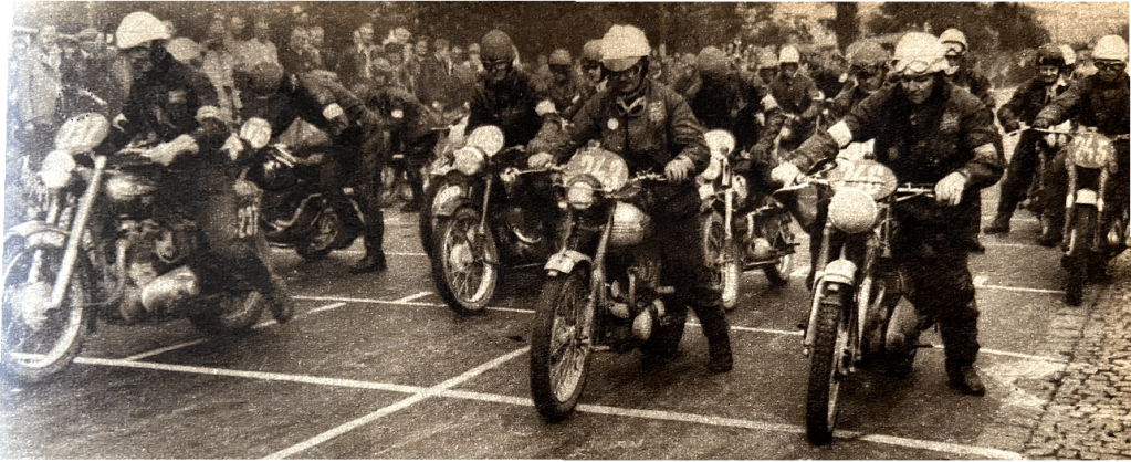 September 15 to 20 and was run over a comparatively level route , for an ‘international’, 1,470 miles long, with the headquarters in Gottwaldov…To the left of the entrance are six Czech vans containing every conceivable spare from a cotter pin to a complete frame for both CZ and Jawa machines. Certain machine components are marked by the organisers during weighing-in and may not be changed during the event; but such components were available for fitting before machines were handed in to the closed control, and those which could be fitted later were available for competitors who might re-quire them during the week. Immediately beyond the Czech vans there is a huge parc fermi, the tented enclosure in which machines are parked each evening so that competitors may not have access to them. Behind the starting area are workshops equipped with lathes, drilling machines, grinders, welding equipment, hand tools, and ramps—with everything, in short, that competitors could conceivably require during the week. Finally, there are ablution tents with hot and cold water so that riders may wash and brush up before returning to their hotels just over a mile away…The great majority of riders from foreign countries, together with team managers and officials, are housed in the vast, nine-storey Hotel Moskva, in the centre of the town. In the hotel are the organising club’s offices, meeting rooms for officials, Press offices, dark rooms for processing films, a customs office and a bank. There is no shortage of interpreters, which is appreciated since practically no one from outside Czechoslovakia is familiar with the mother tongue. Food is good and plentiful though, like almost every other commodity in Czechoslovakia, it is very expensive both to Czechs and foreigners. Most competitors from European countries rode their machines to the venue. The Netherlands teams, the Vase A on 250cc Jawas, and the Vase B equipped with a 499cc BSA Gold Star, a 498cc Matchless and a 175cc German Maico, rode from Holland; they took three days over the journey. As expected the German Trophy team arrived magnificently equipped. The team comprises U Pohl and KL Westphal riding new and functional-looking 175cc Maico two-strokes with pivoted-fork rear springing, and H Roth, Georg Meier and W Zeller, on 590cc R67 BMWs. The Trophy team BMWs used in 1952 were R68 models. These were capable of over 100mph, but they