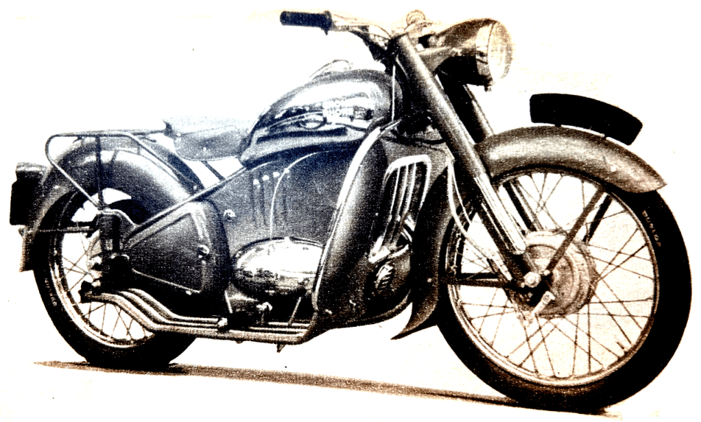 MOTOR CYCLING STALWART Bernal Osborne described the ‘post war’ dream bike he’d designed 10 years earlier with his flatmate Bob Sayer: “Bob was a skilled engineer and both of us were motorcyclists. The friendship continues to-day. ‘Young Bob’ is my godson—that is the way of things…Sayer, when his room-mate had finally gone Armywards, actually made a number of patterns and castings. Three years afterwards they were destroyed by a Hitler rocket…the Sayer-Osborne idea demanded almost complete supersession of then existing British motor-cycle design—not just for the sake of being clever, but for the reason that (so we thought at the time) if the motor cycle was to endure, it would have to sever its long relationship with the bicycle…The engine, planned as a 500cc would have to he efficient, simple and compact. Bob had a soft spot for the slogging-quality plus high-speed performance of the Ford V8. So we mentally chopped one in halves and made a V4…Details of the 90° engine should include mention of the almost-square bore-and-stroke dimensions (about 52x57mm), giving low piston speed at the fairly high rpm envisaged as being forthcoming from the well-designed (we thought at the time and still do) side-valve-type combustion chamber. We adopted a fine idea, that of the hydraulic tappet, promising ourselves a measure of mechanical silence hitherto undreamed of in the motor cycle world…The frame was visualised as a structure of light-gauge welded pressings. Cross-sections of the various channel, and box, frame components are shown in Sayer’s side-elevation drawing. The lower frame section is designed to be jointed and detachable at points ‘A’ and ‘B’ and, with it, can be withdrawn the entire engine-gearbox unit. Frontally the top, main pressings are riveted and welded à la Zündapp or Coventry-Eagle and accommodated in a central petrol tank recess is a battery and glove, or tool, cubby…Though the phrase had hardly been coined in 1941, dual-seat equipment of an advanced type was featured. Let the ‘moderns’ note that here we had no rubber-covered metal pressing, but individually sprung front and rear seats, made as a unit, for rider and passenger. How could either of us have known in 1941 that within the span of a decade the majority of British manufacturers would have relinquished rigid frames and that, in some cases, after a trial period with plunger springing, they would rift over to the swinging-fork theme, not only in Britain but in the BMW ‘fabrik’ at Munich too…the telescopic fork vogue was destined to sweep the world like wild-fire so soon as hostilities were finished. Working without that knowledge, Bob and Co sought something even better than the only telescopic fork of which they had knowledge—that of the BMW. The result of much cogitation…the forks are pressings, rigidly mounted and forming a lower pivot point for swinging-link arms…Then we ” clad the thing, and, having no precedent as a guide, I think we rather overdid the enclosure business. Perhaps we drew unduly on the Francis-Barnett ‘cruiser’, a model of which I then happened to own. Note the ‘turn-screws’ used to secure the tail, the engine bonnets and’ exterior tank panels…”