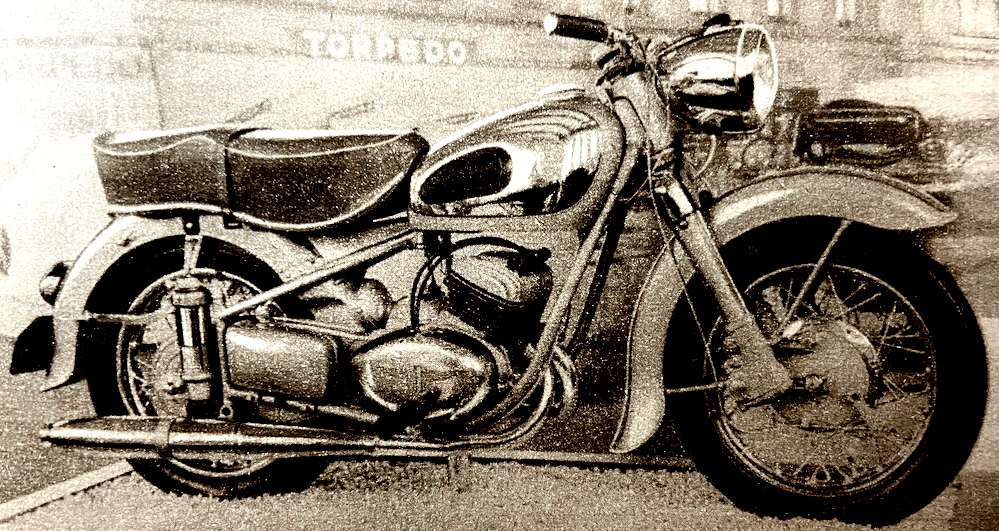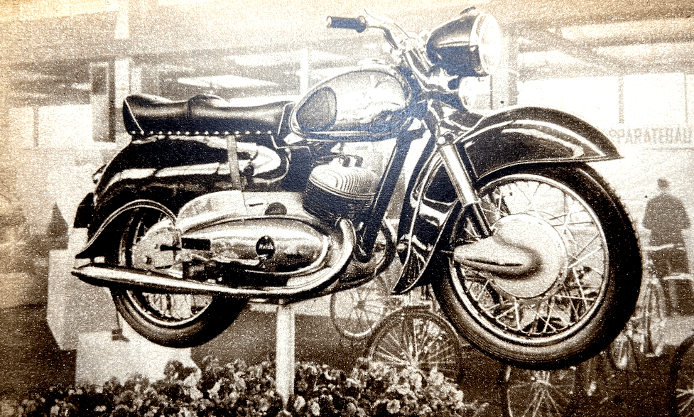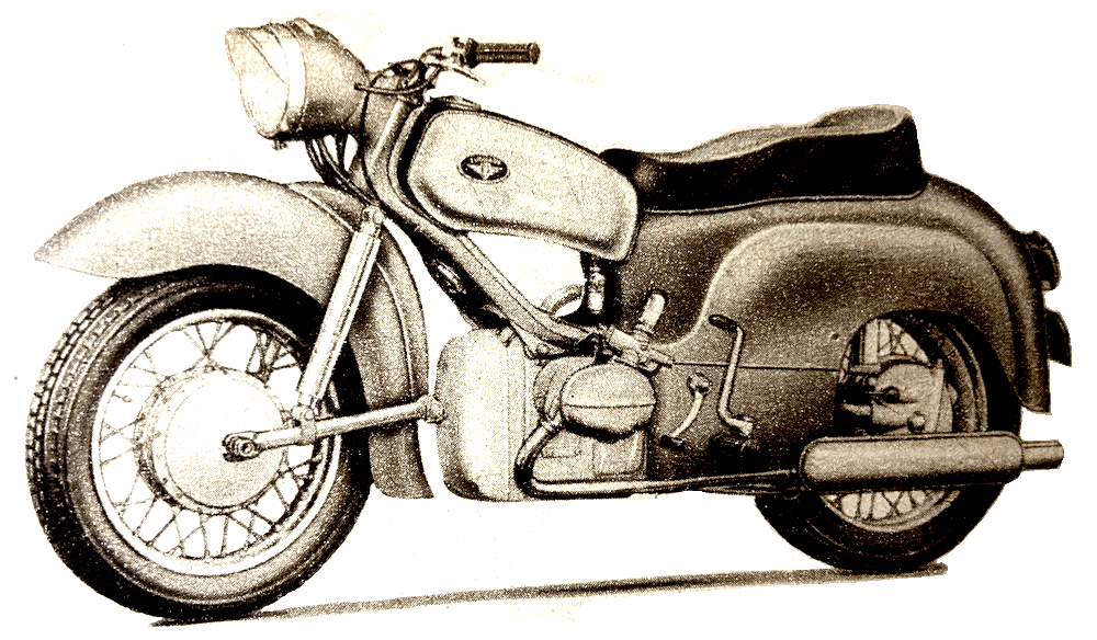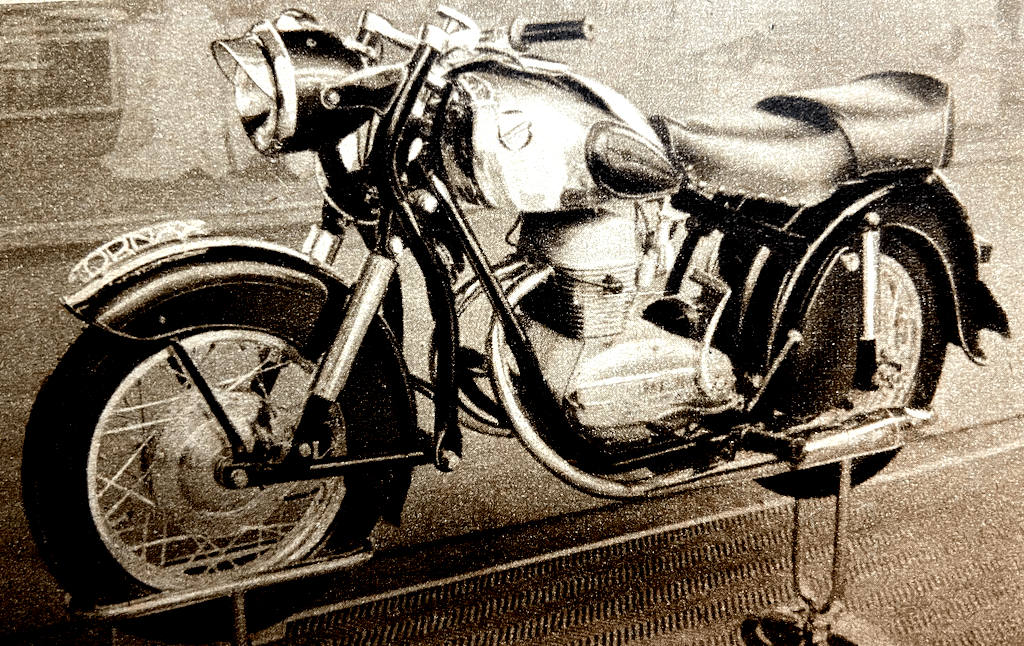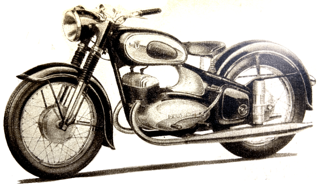 pivoted rear fork is controlled by air only. Price of the Perla in Germany will be approximately 560DM—about £49 [£1,775 in 2026]. The scooter has been slow in gaining popularity in Germany but indications at Frankfurt are that it has definitely ‘arrived’. Scooter production figure for 1950 was 9,110. In 1951 the figure was more than doubled and, in 1952, 39,404 scooters were produced; the last total may well be doubled this year, for production during the first six months was 32,451. Established models such as the NSU Lambretta, Goggo, and Heinkel appear in unchanged form. Additions exhibited are the Victoria, Strolch and Durköpp models, all of which are sleek, practical, beautifully engineered little vehicles. BMWs are largely unchanged. A new model, however, is a 498cc production racer of which between 30 and 50 will be manufactured with production beginning in the spring. This model has a telescopic front fork, pivoted-fork rear springing, and carburettors in place of the injector units used on the factory racers. Modification to the single-cylinder 250 are that the front fork is now hydraulically damped, the toolbox is in the side of the tank instead of in the top as before, and air is fed to the carburettor through a long induction pipe enclosed within the fuel tank. British Excelsior, Matchless, Norton, Royal Enfield and Triumph machines are well displayed. They are all in the form in which they are well known except that the Triumph Thunderbird is fitted with an AC generator.”