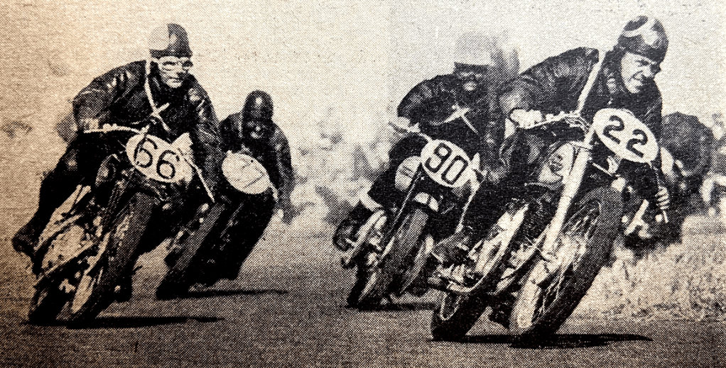 “SOME OF THE WORST motor cycle accidents on the road arise from a number of young fools attempting to duplicate the ‘clumping’ which we see at the first bend on a cinder track or after a mass start on a road circuit. If the front lad comes off at a bend, they all come off, not being so skilled as the Dukes and the Youngs. Such a pile-up occurred up in Yorkshire the other week, with extremely messy and grievous results. Kipling once said: ‘Down to Gehenna or up to the Throne, He travels the fastest who travels alone.’ For ‘fastest’ substitute ‘safest’; and interpret ‘alone’ to imply a spacing gap of not less than 25 yards on public roads. In the Island or at Wembley, clumping—though always fraught with peril—is far safer than in road work; for at least you know that round the next corner you will not meet any traffic coming the other way. (NB—’traffic’ may mean anything from two cars abreast to a large flock of sheep.)”—Ixion