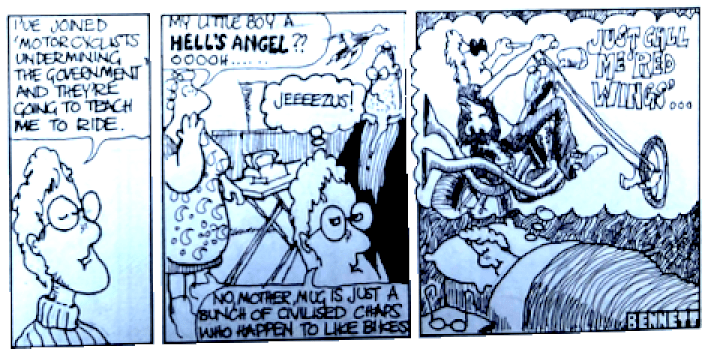 Busy busy…before getting stuck into the 1950s I’ve been ploughing through the ‘pending’ folders which, as usual, are overflowing with images from mon ami Francois’ astonishing archives. So if you’d care to take a gander at the WW2 page you’ll find more than 200, yes, 200 newly published wartime pics of men (and woman) and their motor cycles, from the Home Front to the Eastern Front by way of Normandy and North Africa. About 20 more poems have been added, ranging from not bad to delightful. There are now three picture galleries; Melange 3 already has more than 100 assorted images with more to be added on a daily basis—with a backlog of some 2,000 images look out for Melange 4 in due course. And if you’d care to open the ‘ARTWORK/HUMOUR’ page you’ll find in its entirety the 1970s Motor Cycle Weekly cartoon strip Felix, Fanny & Co, courtesy of its creator, Roger Beale. It is truly bonkers. Here are some tasters: