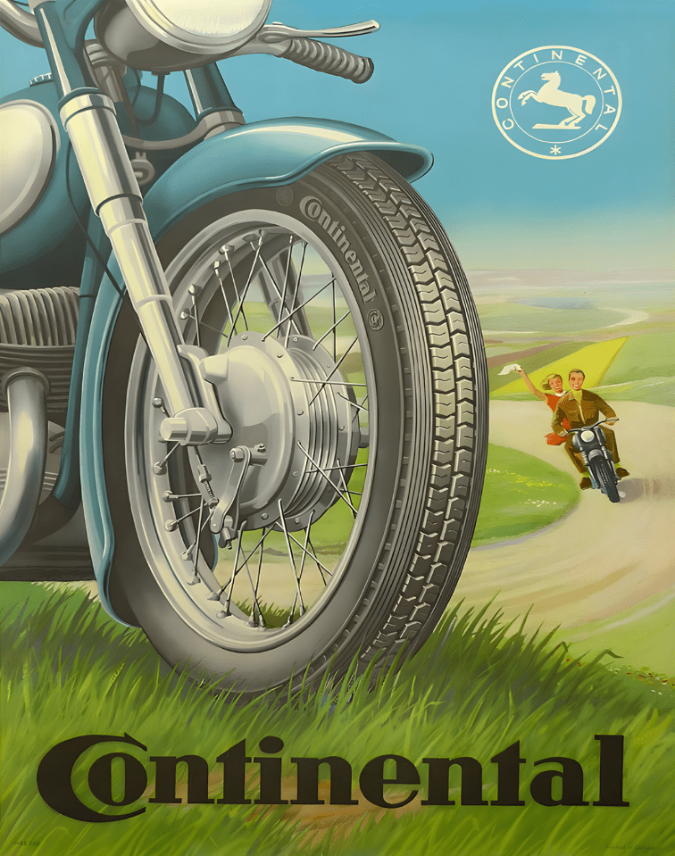 The tagline for the ad for Hutchinson motor cycle tyres translates as “solid as steel”.