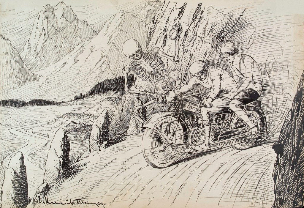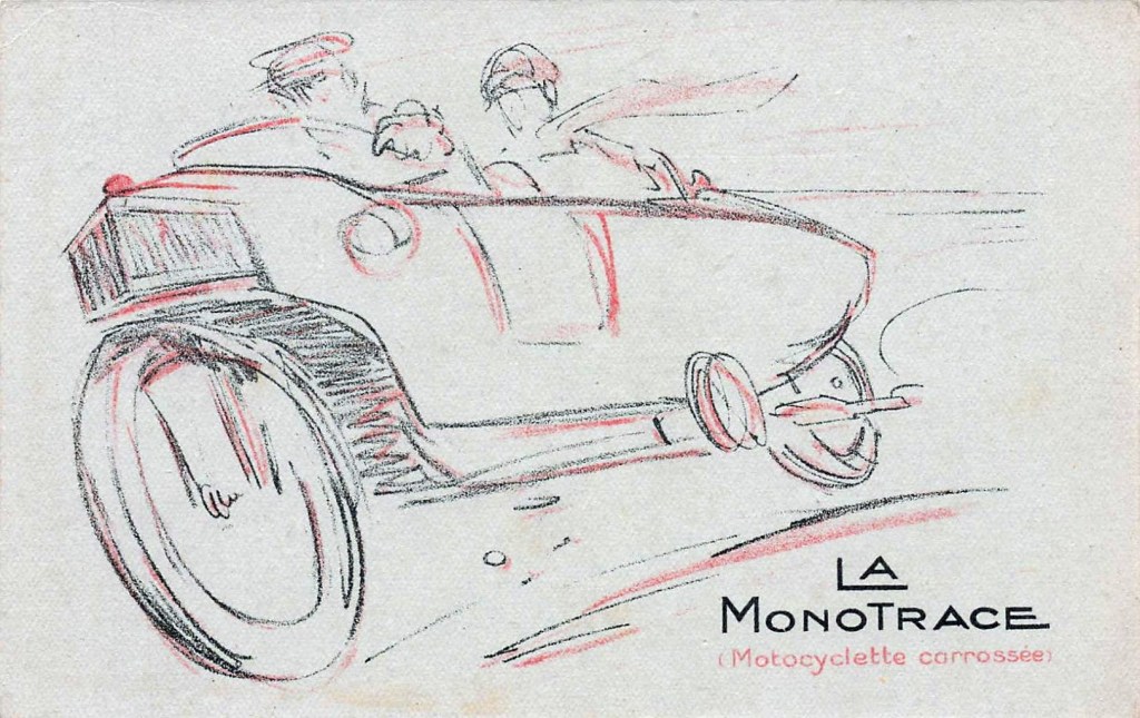 “The motor cycle is very common today and matches the speeds reached by cars, with low consumption and great manoeuvrability. With internal combustion engines of 2, 3 or 5hp they easily carry two people, at 40-50km/h; they are often fitted with a third wheel, a light body equipped with a comfortable seat. This is the sidecar.”
