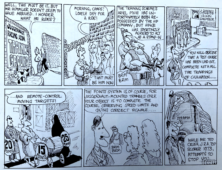 A NEW START! Well, a new start to this page…when I were a nipper filing photos for Motor Cycle Weekly, before editor Mick Woollett let me anywhere near a typewriter, MCW was enlivened by what I believe to be the best cartoon strip to grace the pages of a motor cycle magazine, courtesy of a gentleman motor cycle journalist named Roger Beale. OK, yes, I love Ogri too and Paul Sample is a bloody genius and yes, I have a complete set of the Ogri collections. But for sheer silliness combined with a dab of surrealism Beale’s all-too-short-lived look at the adventures of a gormless recruit to the wonderful world of motor cycles is…well, judge for yourselves. Here, for the first time (drum roll please, maestro) I am proud to present the complete run of…
