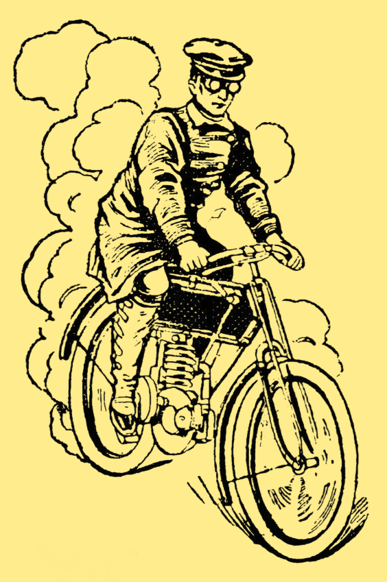 Another whimsical bike, circa 1909. The period caption ran: “What speed could it attain with this seven-cylinder rotary engine?”