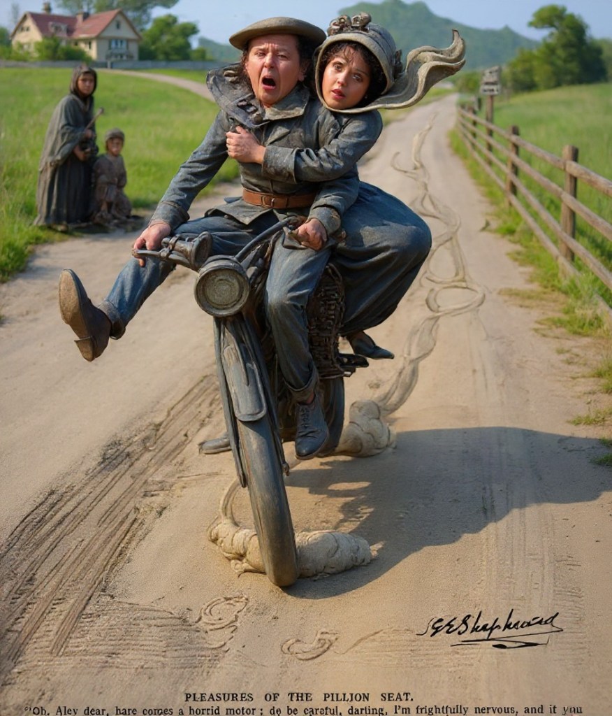 1910 caption…She: “Do motor cyclists often lose their lives?” He: “Not more than once.” Yes, this joke is THAT old.