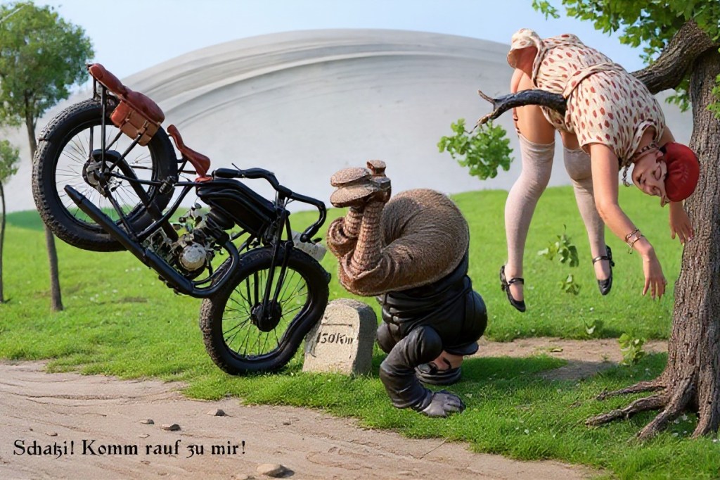 “The motorcycle is a bicycle that has been fitted with a motor to make a lot of noise or to keep it running. In this case, it can be pushed laboriously, making the sport all the more enjoyable.”