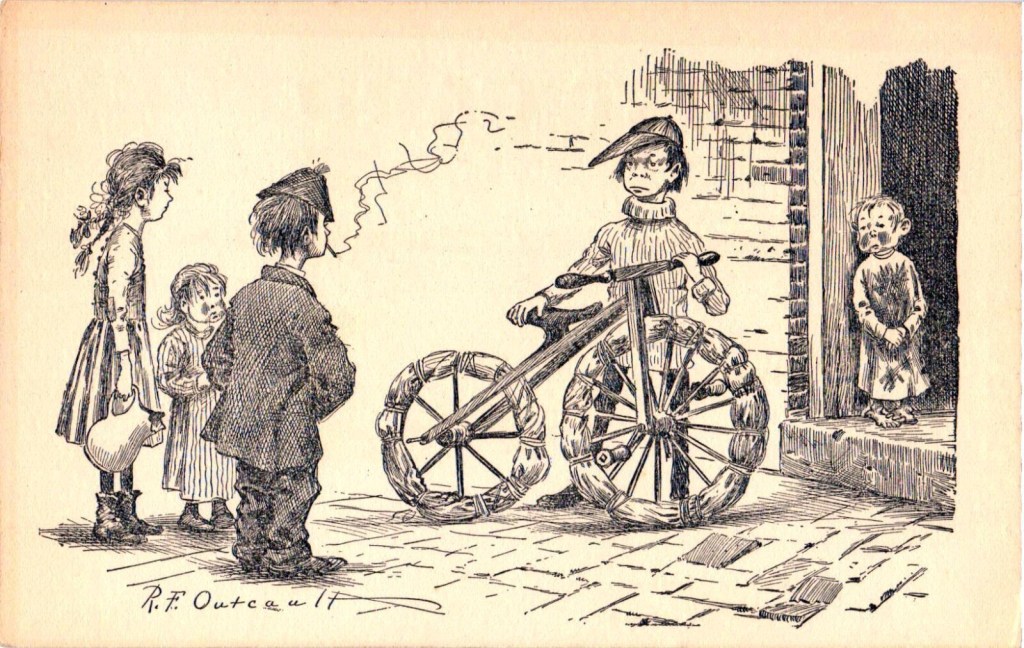 “Locomotion across the ages: The petrol tricycle—the bane of pedestrians who are too slow to get out of its way—is one of the most distasteful means of locomotion. Its unpleasant smell, the nervous fatigue suffered by the rider, have done much to slow down the vogue of the petrol tricycle, which is gradually being replaced by light carts or automobiles powered by electricity or mineral spirits.”