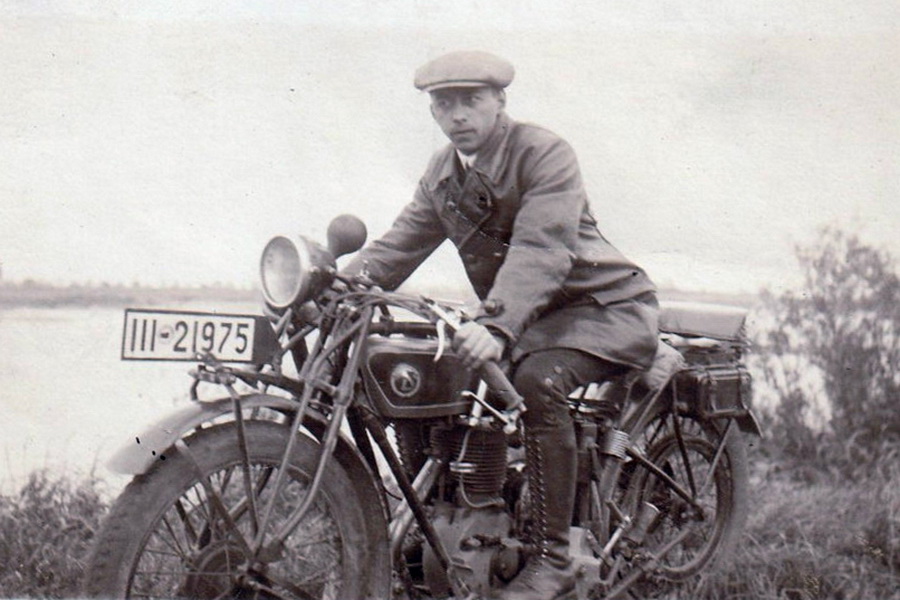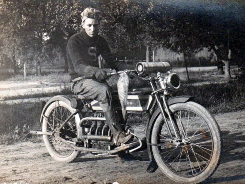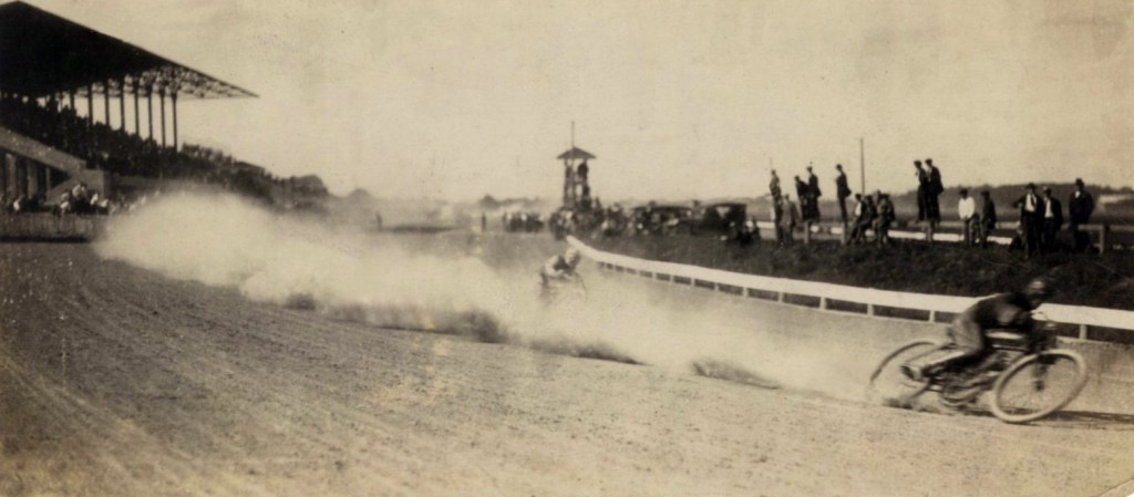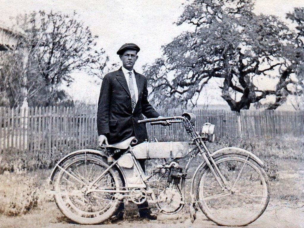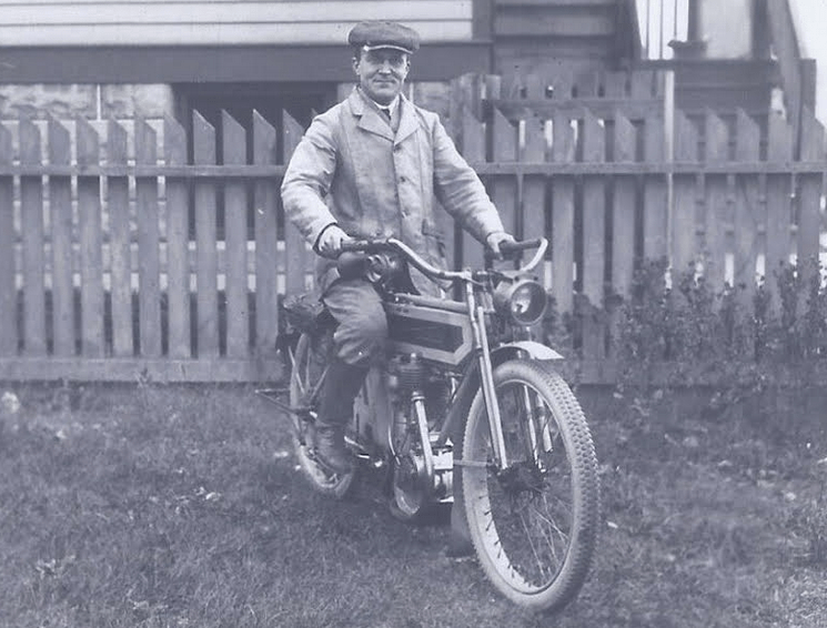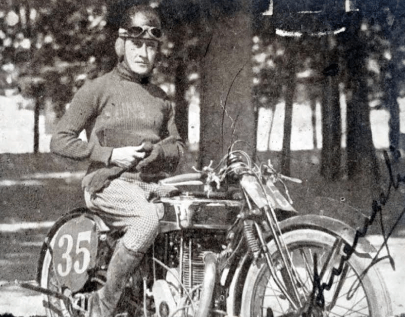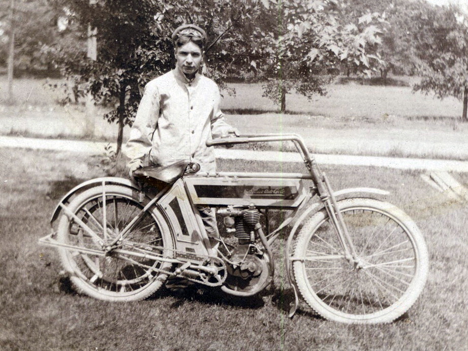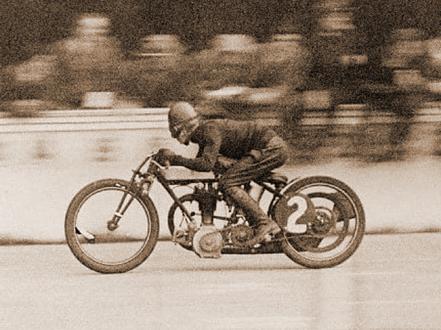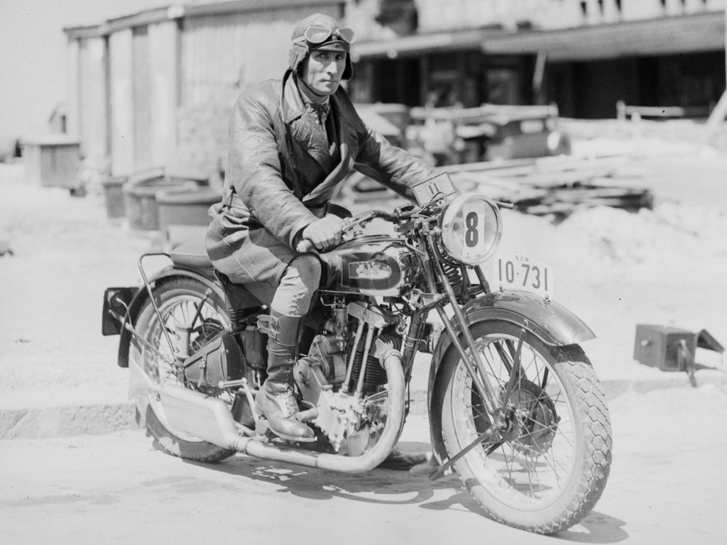 Swedish race ace and designer Helmer Petterson aboard ‘Big Bertha’, his converted ‘Big X’ Excelsior. Helmer spent the 1920s working for at the Schwinn factory in the US, rising to become an engine tuner for the Excelsior dirt track team.