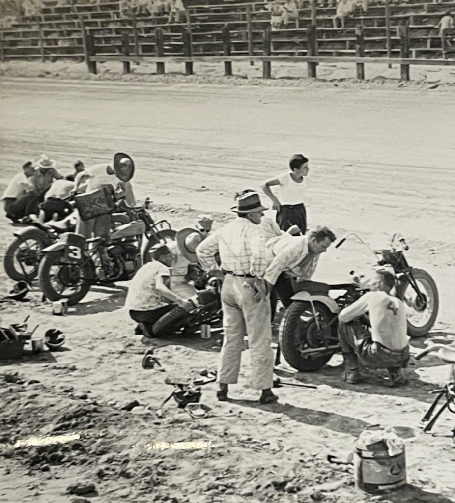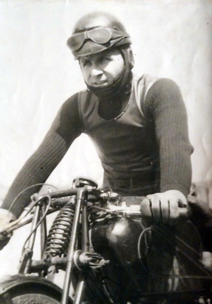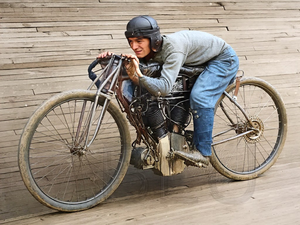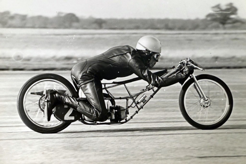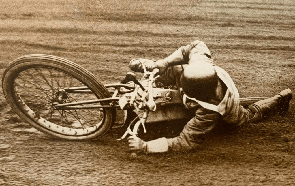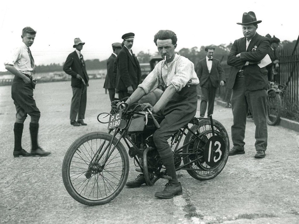 Swedish race ace and designer Helmer Petterson aboard ‘Big Bertha’, his converted ‘Big X’ Excelsior. Helmer spent the 1920s working for at the Schwinn factory in the US, rising to become an engine tuner for the Excelsior dirt track team.