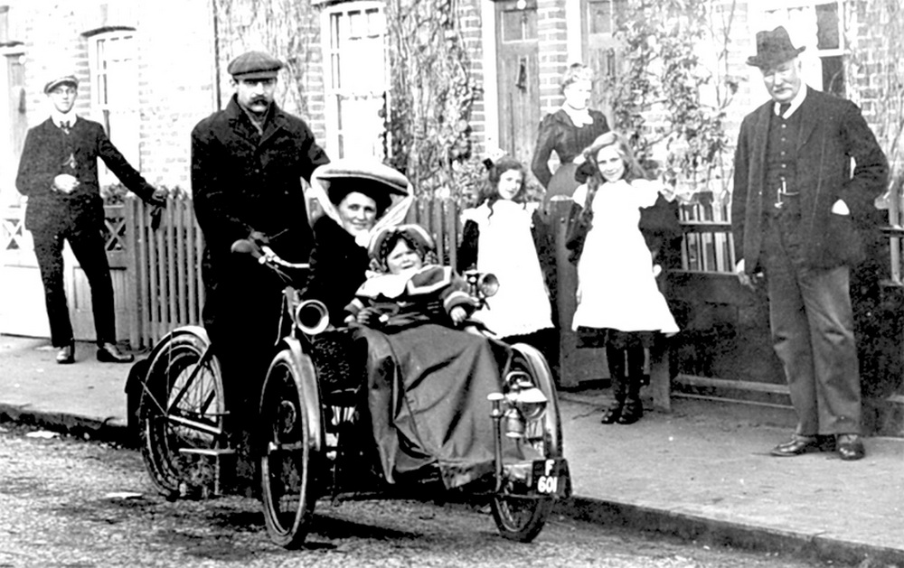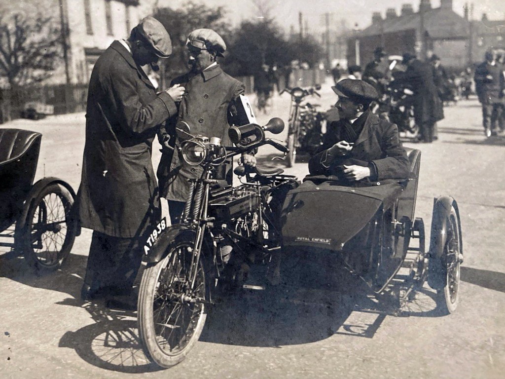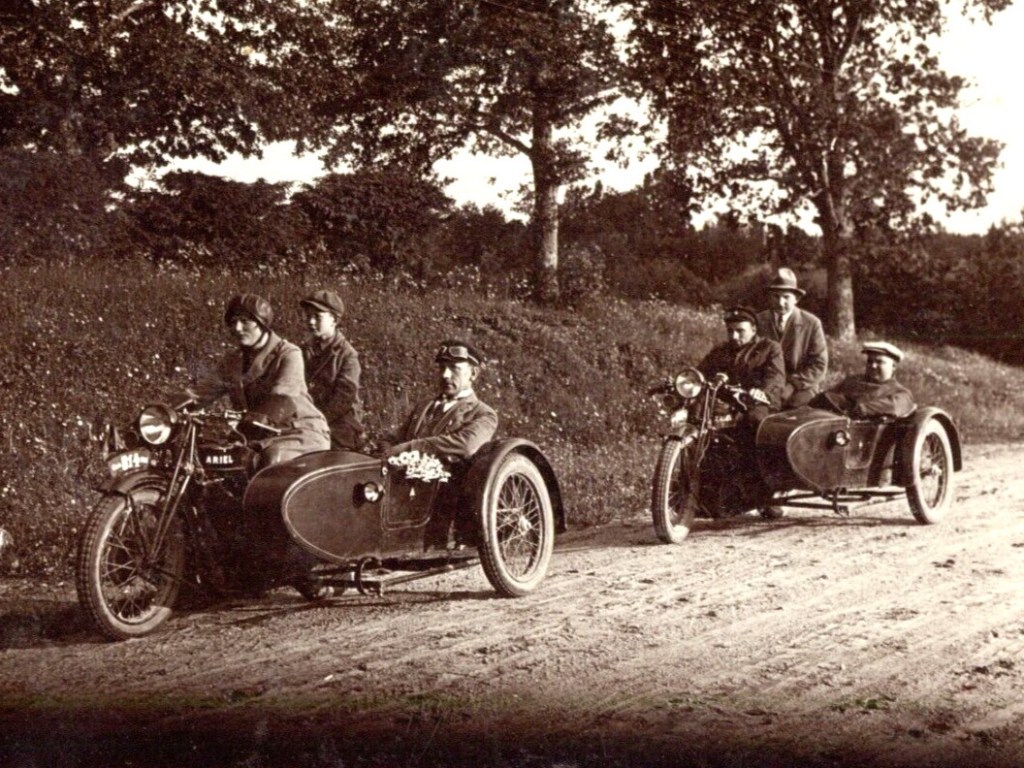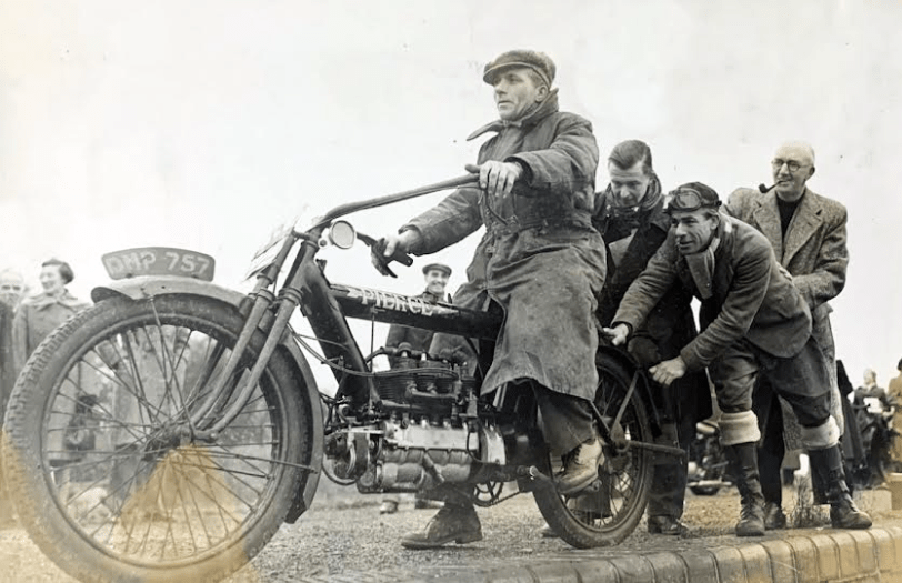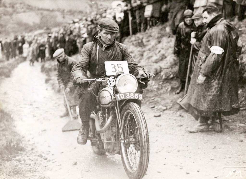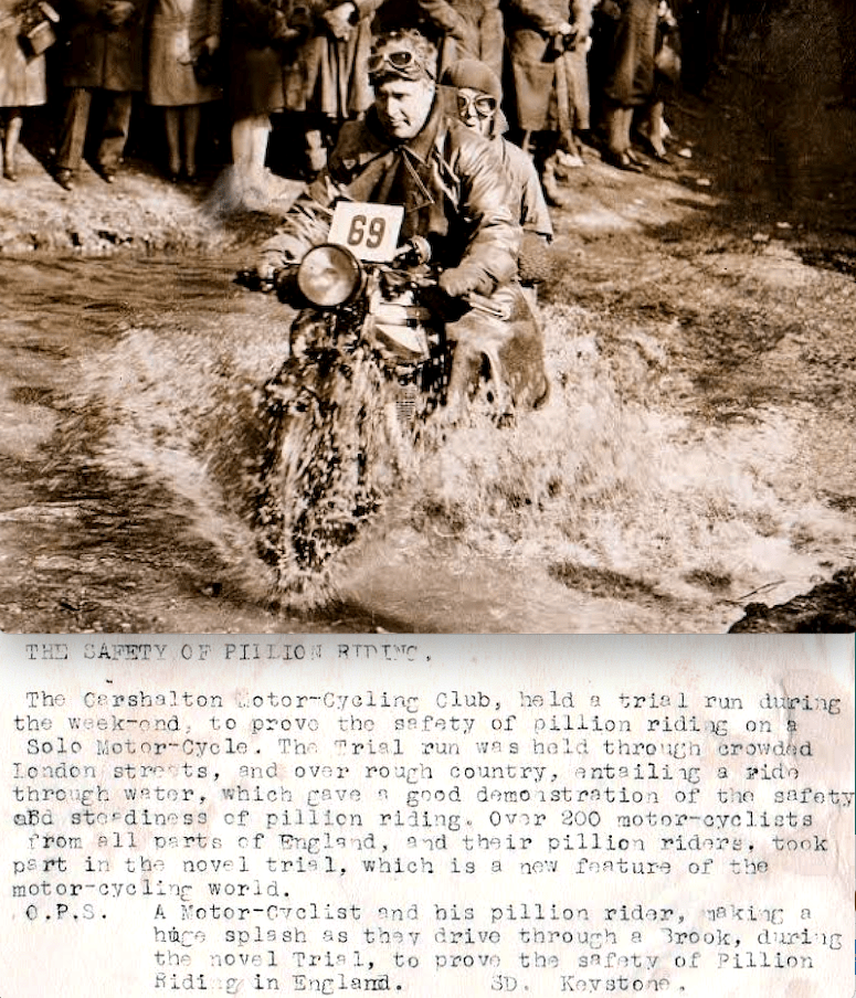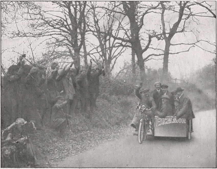 “Excelsior 5/6hp big single climbing Stoneleigh Hill with sidecar and EIGHT up. Total load of passengers, 12cwt 1 qr; combined weight, 18cwt 14lb. Gears—4½, 7¾ and 13 to 1.”
