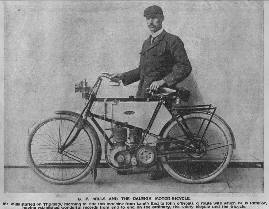 “GP MILLS, THE FAMOUS long-distance cyclist of the ’eighties and ’nineties, the mention of whose name invariably recalls the two most widely-separated points of Great Britain, left Land’s End early on Thursday morning last en route for John o’Groats. The journey of 886 miles is no new one to ‘GP’, as most readers of The Motor will know, but having accomplished it in record time on every form of muscle-assisted cycle—solid-tyred ordinary, pneumatic safety, tricycle, and tandem—he was anxious to attempt it on a motor-assisted machine…Leaving Land’s End at 8am on Thursday morning, he arrived at John o’ Groats at about a quarter to eleven on Saturday morning, the full time of the ride being 50hr 46min 30sec. This beats T Silver’s 64hr 29min by nearly 14 hours. Mills was two hours late in starting from Land’s End, and having the bad luck to puncture his tyres more than once reached Warrington four hours behind his schedule. He had made up two and a quarter hours of this time when he reached Carlisle. The next news to reach us was from John o’ Groats, announcing his successful arrival. He had expected to cover the distance in 42 hours, or a little over…Only those who have attempted the feat of getting from Land’s End to John o’ Groat’s in the shortest possible time can have the least conception of what the task entails. The physical strain is enormous, and only a plucky man, and a machine of equal ‘pluck’, are capable of successfully overcoming the difficulties. We have always been strongly inclined to the opinion that the satisfaction obtained from beating the end-to-end record is quite an inward one, far outweighing public kudos, simply because nobody except the aspirant for record honours can understand all that is entailed in the attempt. There have, during the past eighteen months, been a number of attacks on the record, the vehicle employed being the motorcycle, but they have all failed, mainly because the record essayer has had to learn the inevitable lesson. A chat with GP Mills after he had commenced to recover from his recent end-to-end experience could not fail to cause one to marvel at the sterling qualities, the grit and the determination of the man. You imagine him to have come through with teeth clenched the whole way, taking each difficulty as it cropped up as a necessary part of the programme, each heavy shower, each puncture, each piece of vile road, each wrong turning carrying him miles out of the way being just as inevitable an item of the ride as is each mile of the road. Mills had an idea last year of going for the record on a 4½hp motor-bicycle, but he wisely waited for the new pattern Raleigh, and thus his ride was made on